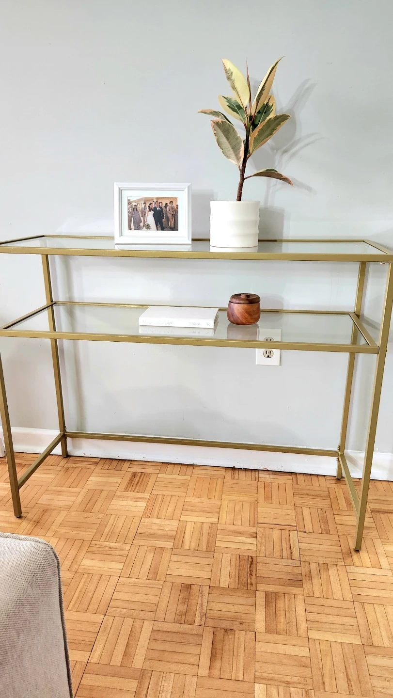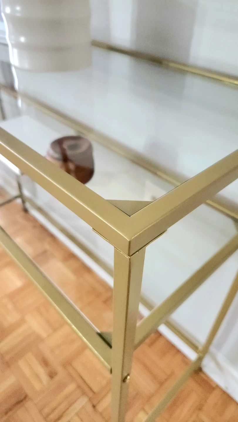 It's brand new and still in box. I have extra, and the pictures are my own. This has never been used and still sealed. Frame is heavy-duty gold color and comes w/ top and middle tempered glasses. Original retail price is $221 including tax (save $$), so price is not negotiable. See pictures and confirm dimensions.