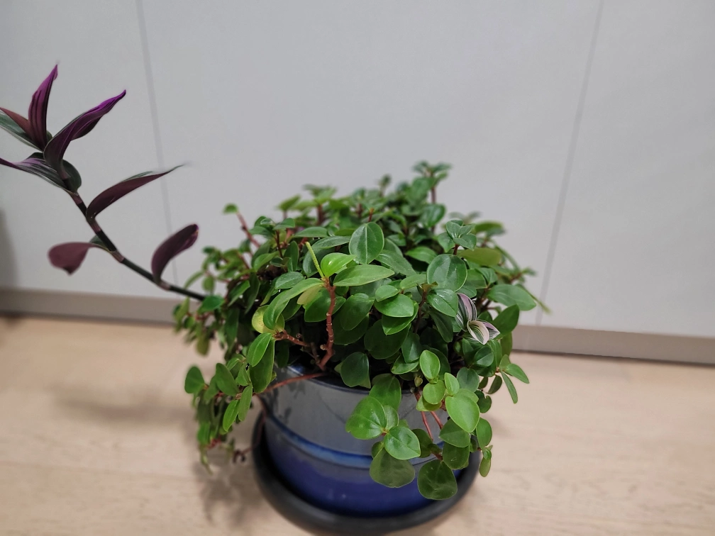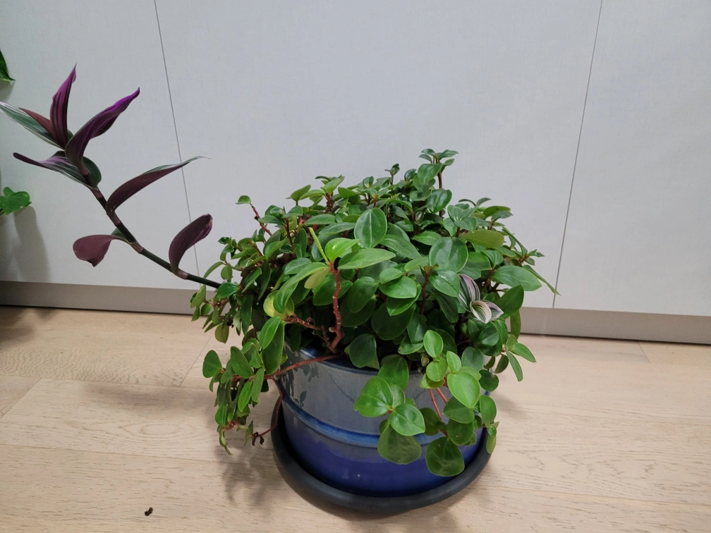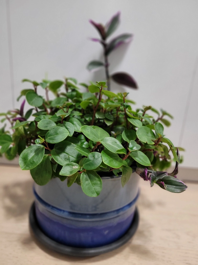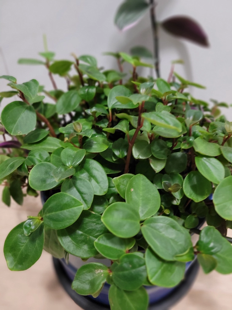 Healthy Peperomia Prostrata, small round leaves. Planted in a blue ceramic pot. Indoor/outdoor plant. It is a good plant for outdoor during summer time.