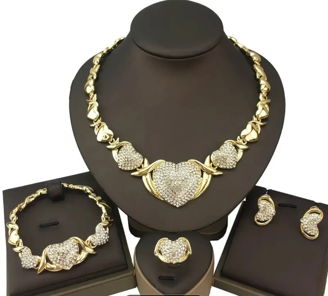 65Selling a beautiful gold-plated jewelry set with a heart design. The set includes a necklace, bracelet, ring, and a pair of earrings. Perfect for adding a touch of elegance to any outfit! Check out my other listings