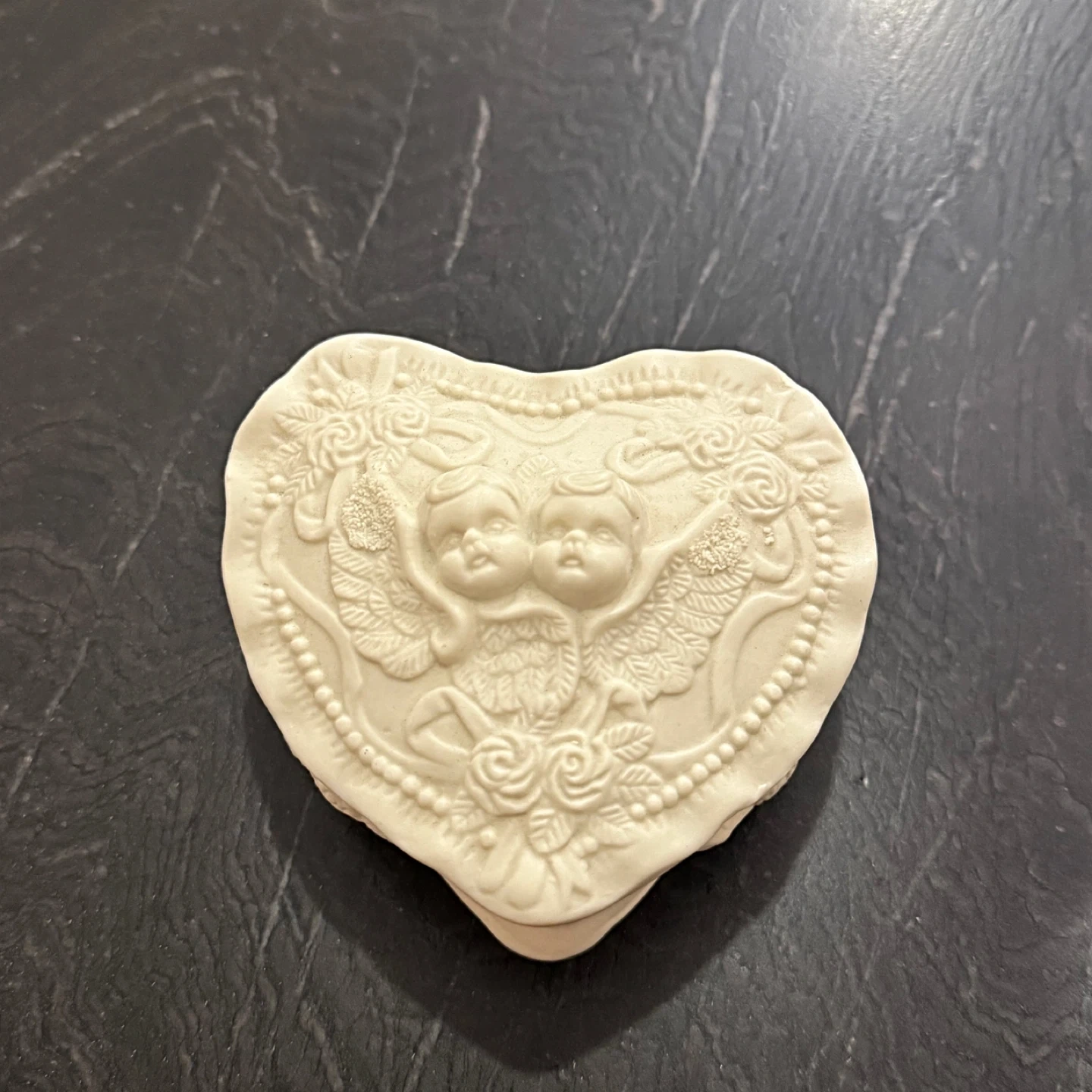 61Cute heart-shaped trinket box! It's perfect for storing small items like jewelry or keepsakes. The box has a lovely design with cherubs and floral details on the lid. It's in great condition and ready to add a touch of charm to your space! CASH ONLY PICK UP ONLY