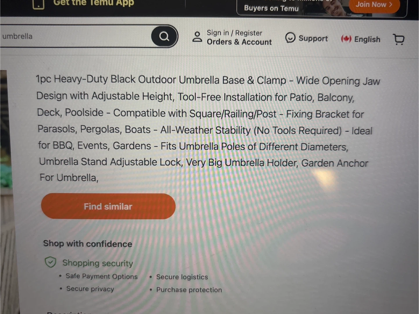 Selling a heavy-duty black outdoor umbrella base and clamp. Brand new off of Temu. Good quality. Turns out it was just a tiny bit too small for my railing. It's perfect for patios, balconies, decks, and poolsides. Compatible with square/railing/post fixing brackets for parasols, pergolas, and boats. It offers all-weather stability and is ideal for BBQs, events, and gardens. It fits umbrella poles of different diameters and has an adjustable lock. The dimensions are 4.2cm/1.65inch diameter for the fixed object, and it's recommended that the diameter be less than 6.5cm/2.56inch. The height is 16.2cm/6.38inch