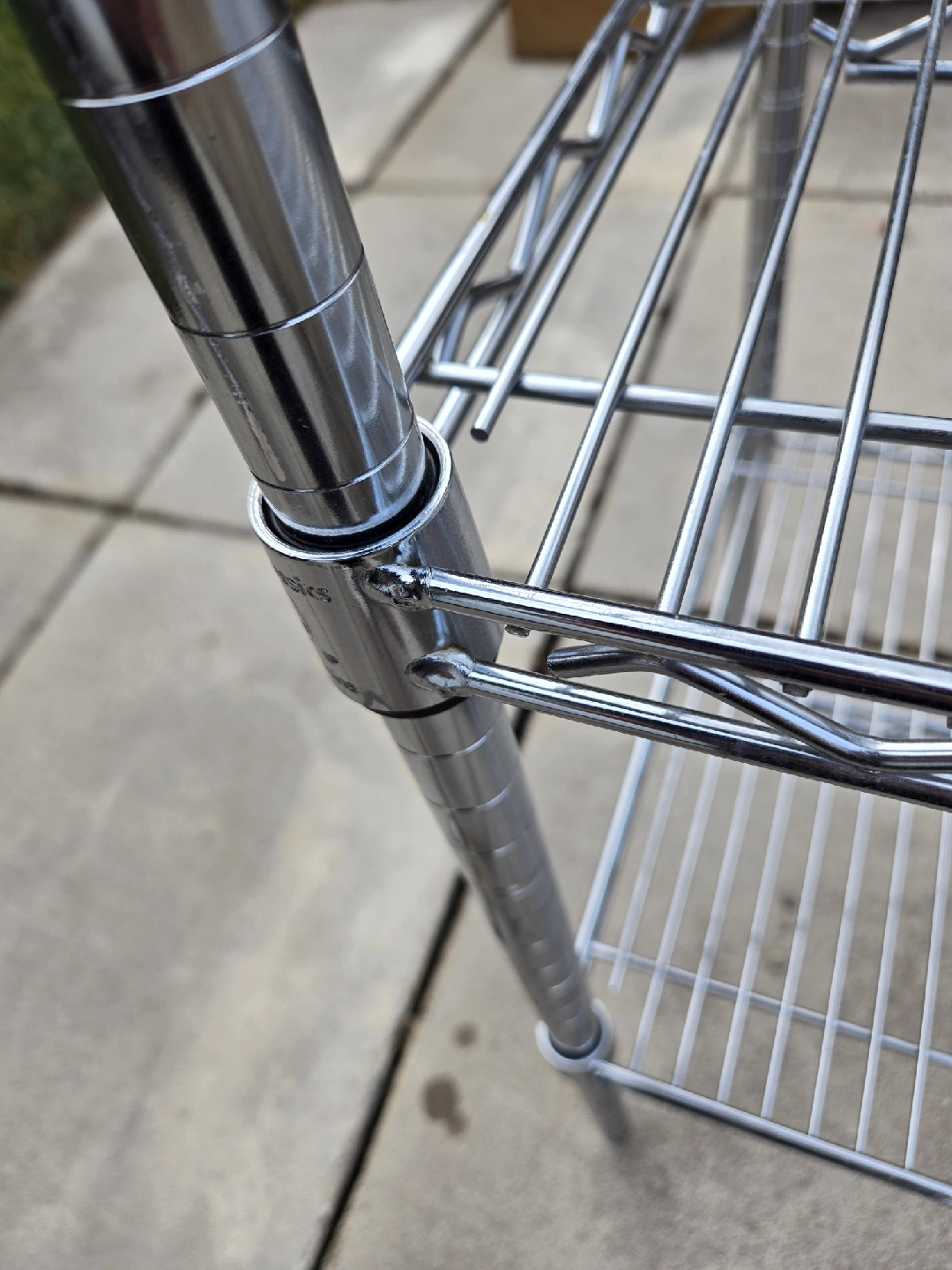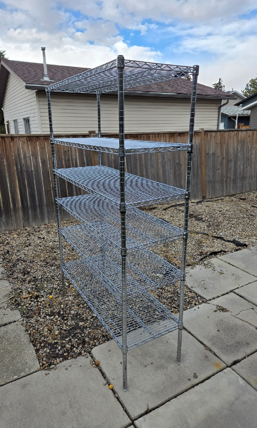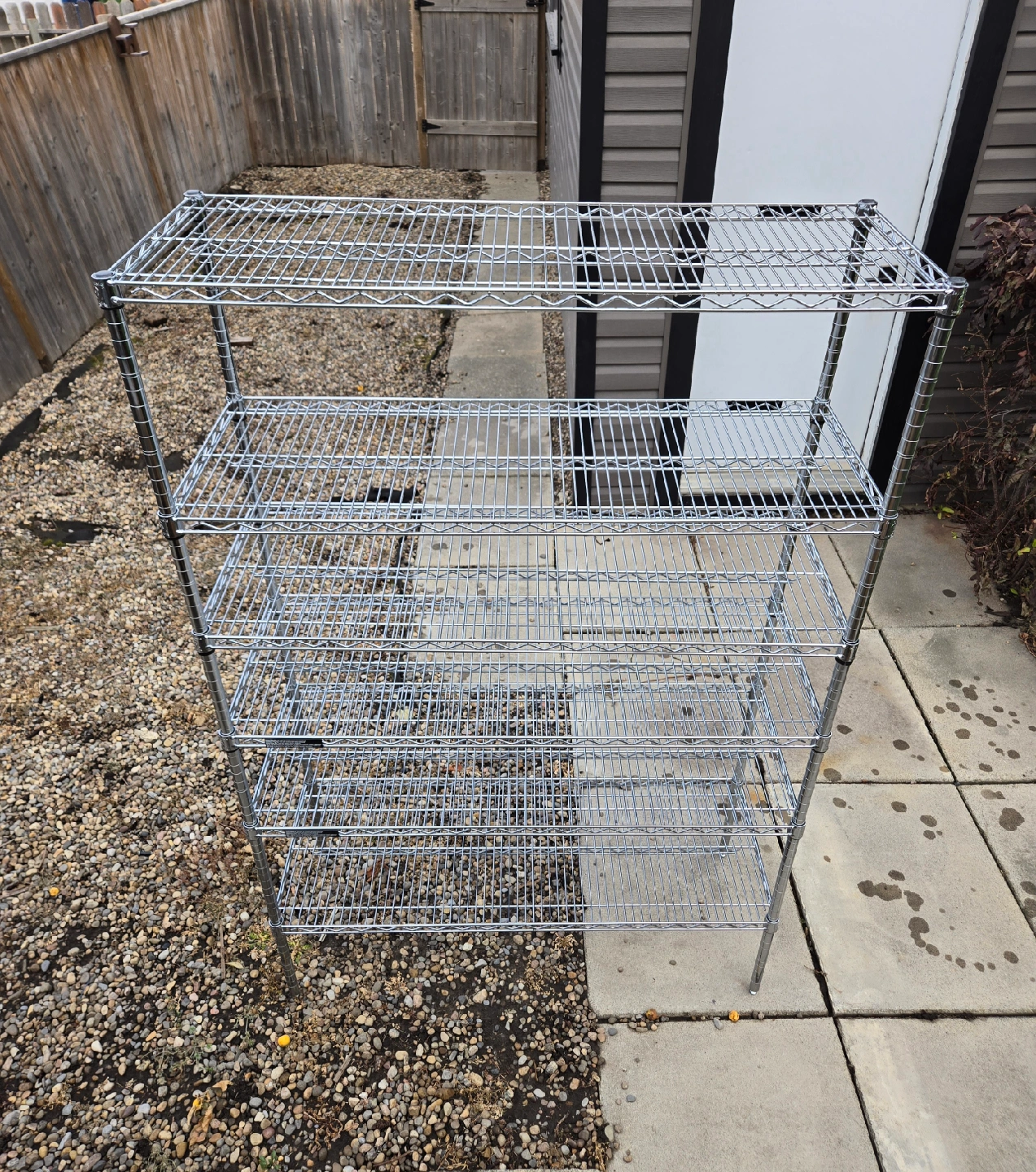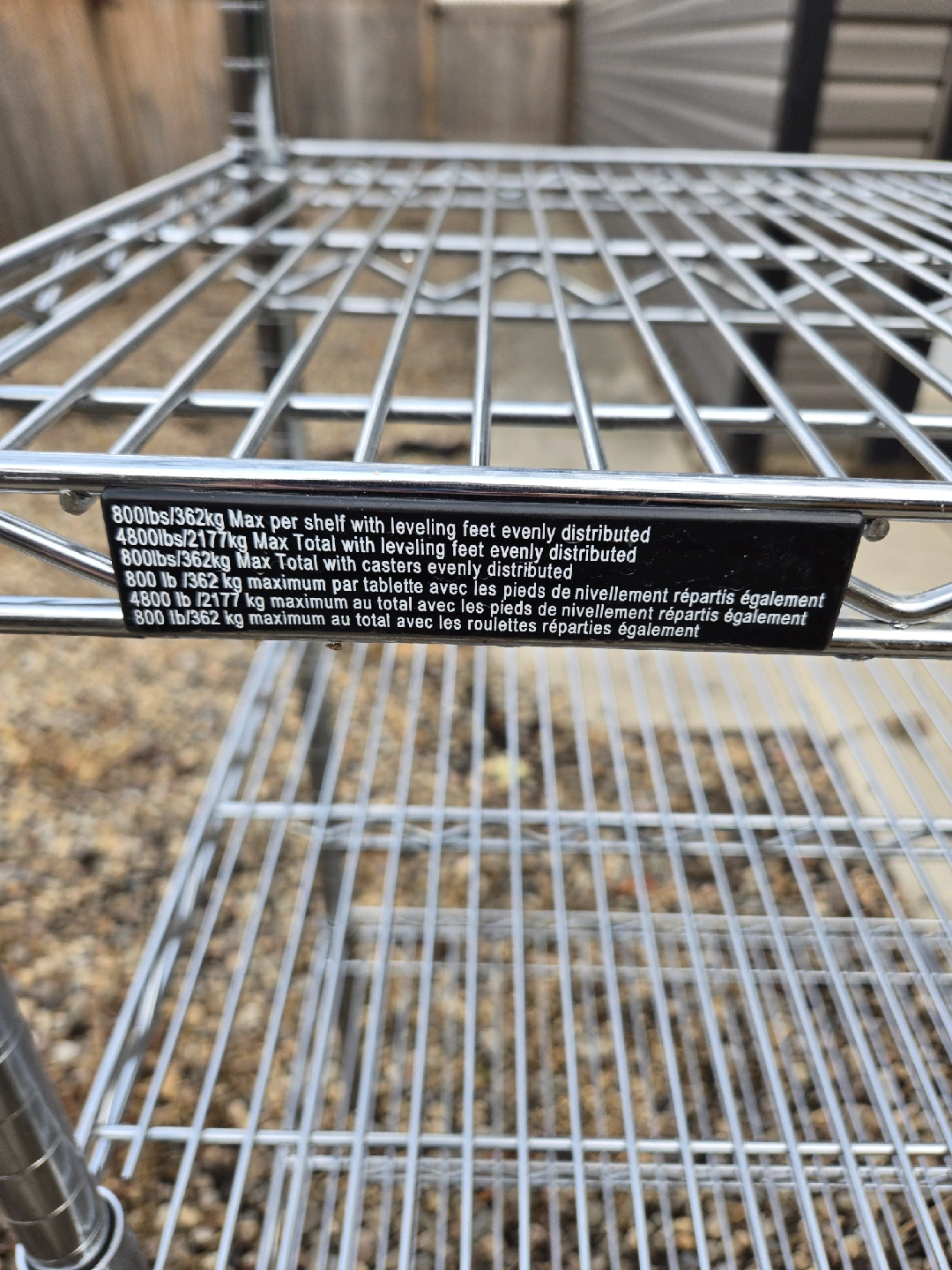 Excellent condition. 73" tall, 18" depth and 47" wide. Sturdy wire shelving unit with adjustable legs to make it level is ready to help you organize your space. Perfect for a garage, pantry, or storage room. Please see picture 3 for max weight limits. Very heavy, will need 1 very strong person or 2 people to move. Price is firm. Same day pickup given priority. Cross-posted. 💥If you have a moment please have a look at my other items for sale.