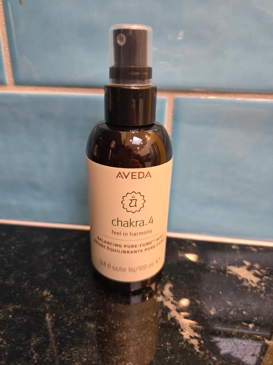 Selling an Aveda Chakra 4 aroma mist. It's a balancing pure-fume mist, 3.4 fl oz/oz liq/100 ml. This aroma mist helps you feel in harmony with its authentic fusion with pure essential oils of Australian sandalwood and palmarosa