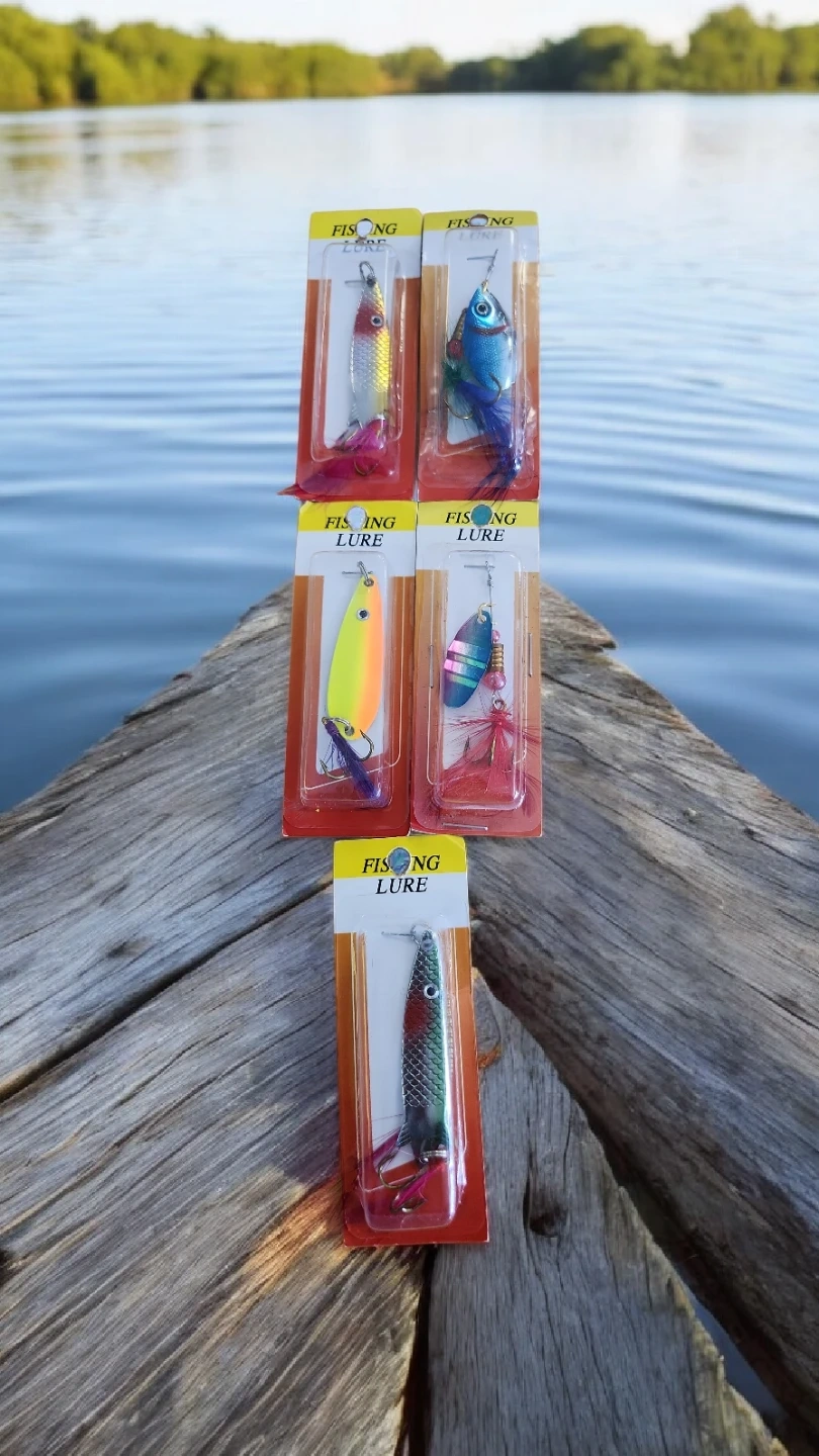 This is a lot of five fishing lures. They come in various colours and styles. They're packaged and ready for use!