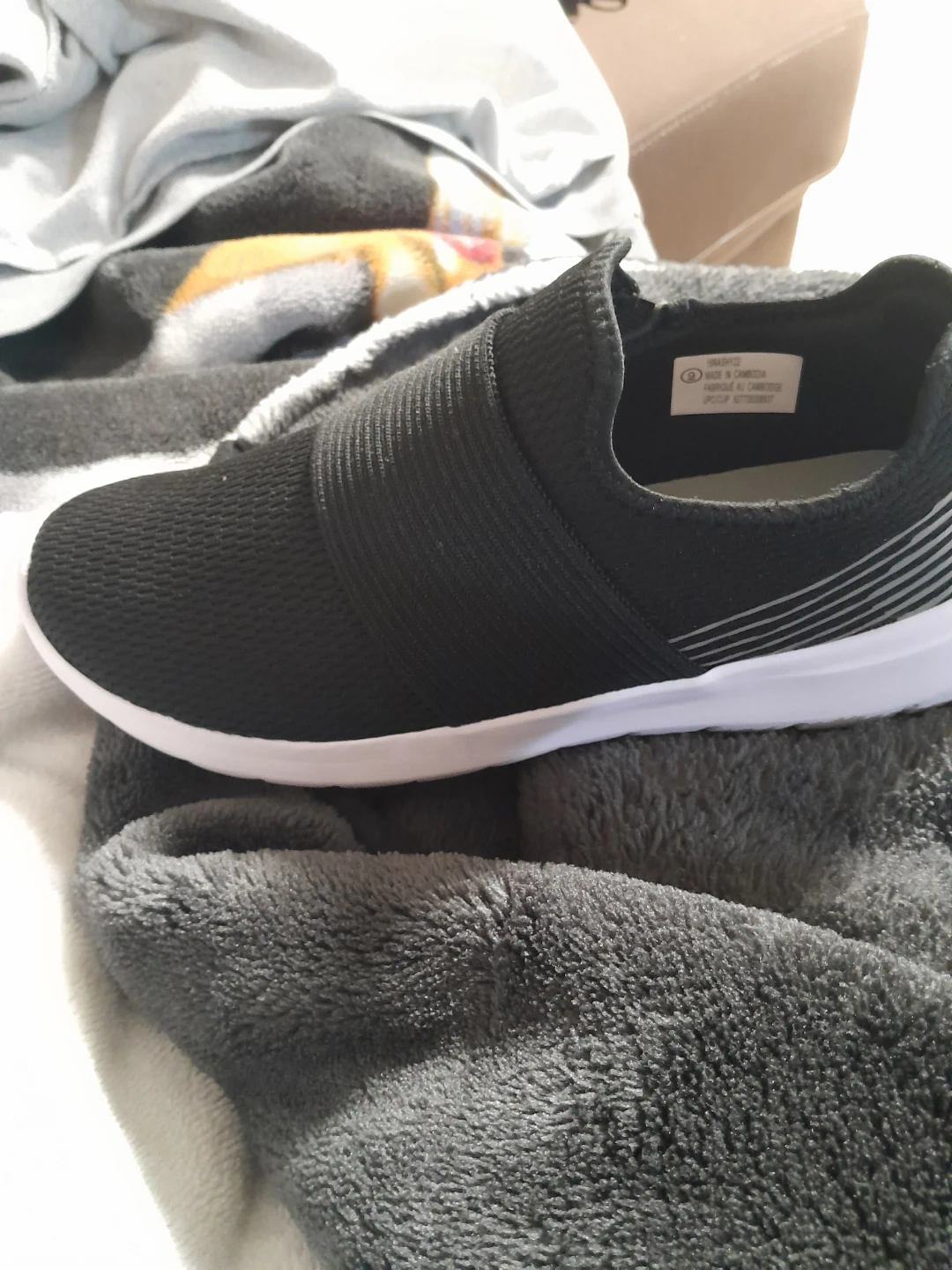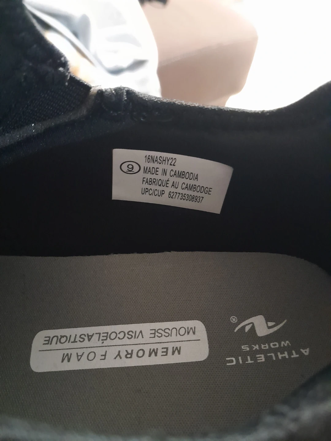 These Athletic Works slip-on shoes are black and feature memory foam insoles. They're made in Cambodia and have a non-marking sole. Size is 9.
