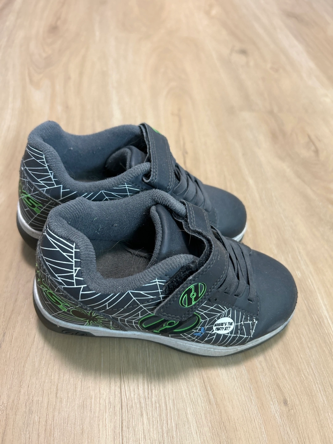 104Selling a pair of Heelys roller shoes in size 13c. They are grey with a spiderweb design and green accents. These shoes are in good used condition and ready for some rolling fun!