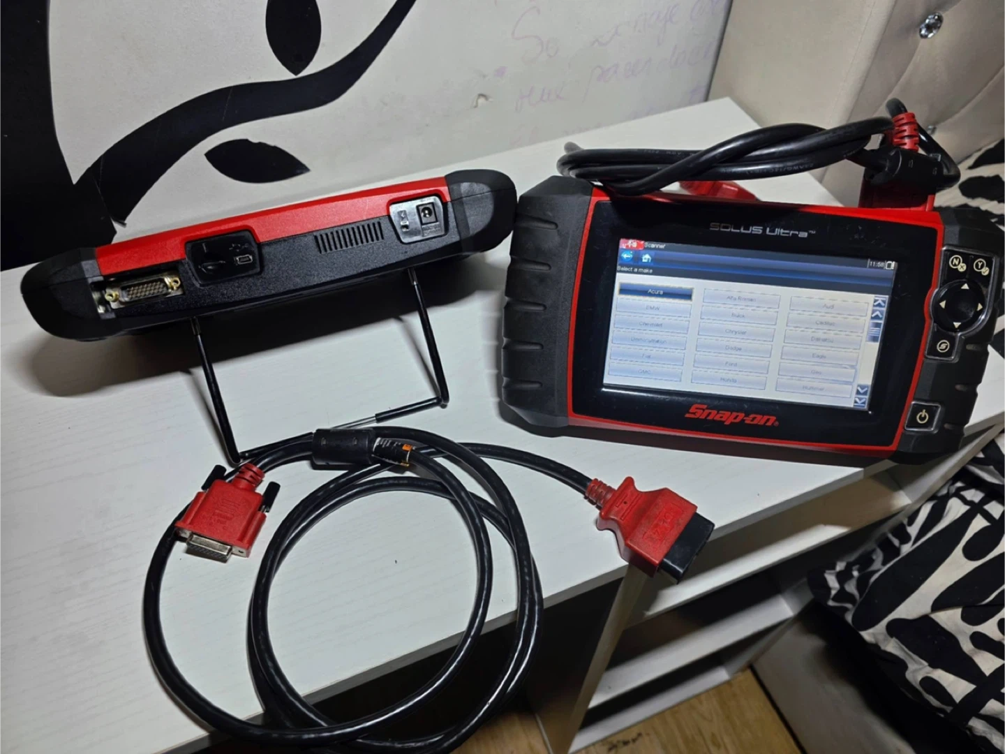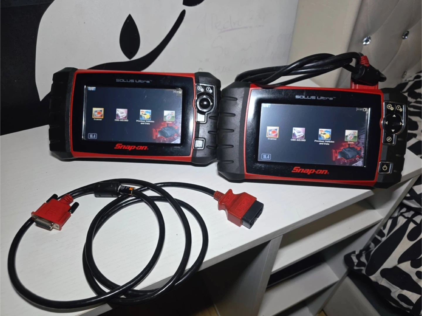 Two Snap-on SOLUS Ultra diagnostic scan tools. Includes cables for connection. These are professional automotive diagnostic things from your or mine card faces.