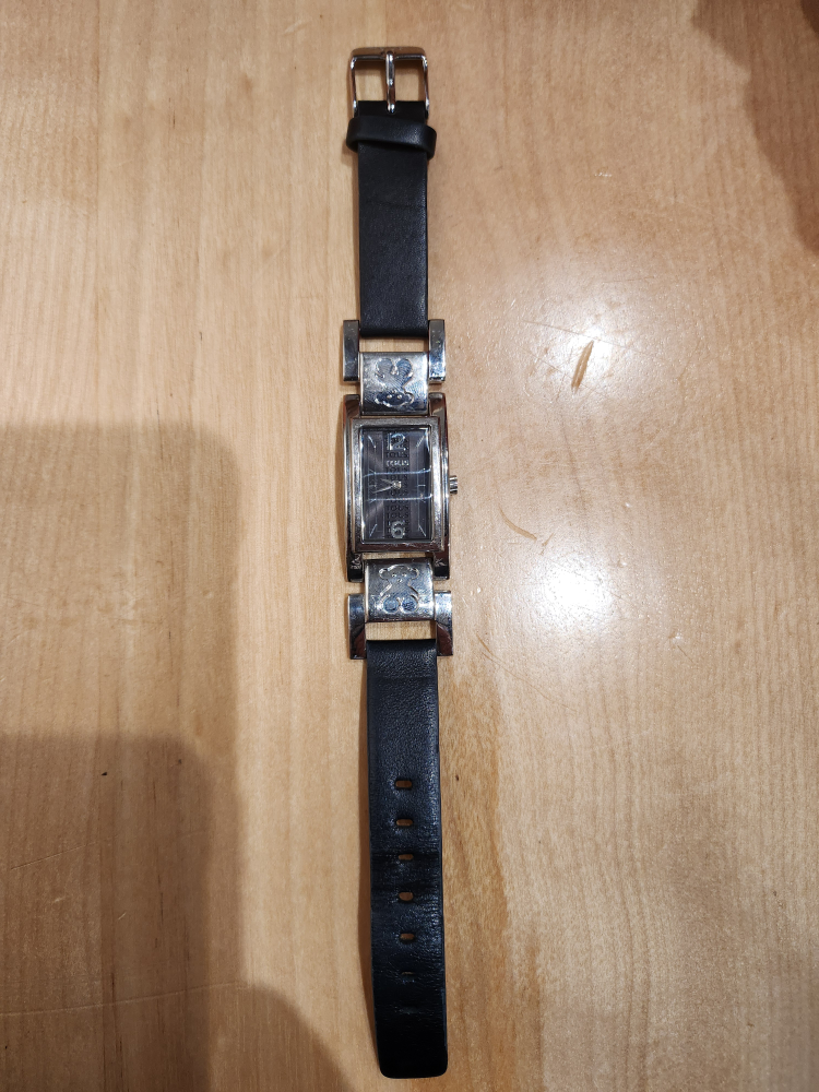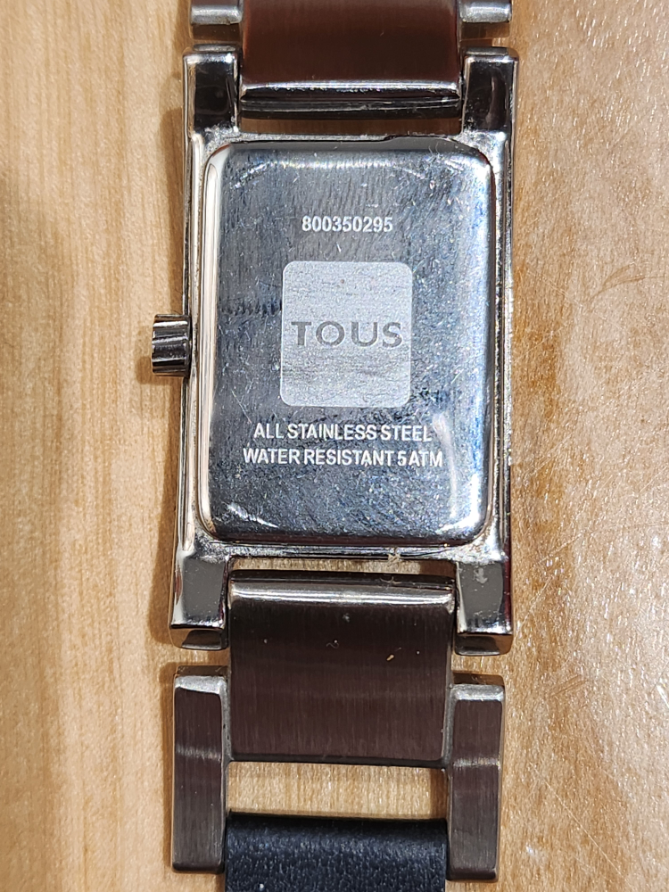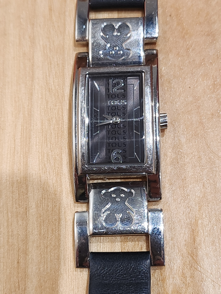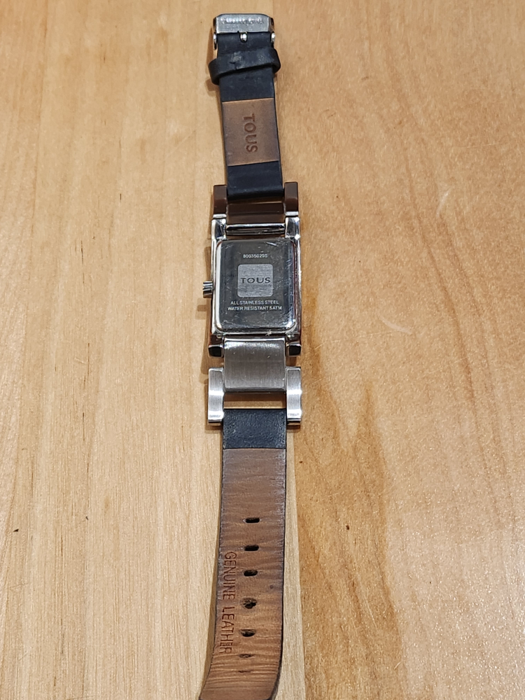 Women's watch by Tous ($300. retail), with a black genuine leather band, stainless steel case, and a black dial. The watch has a rectangular shape.