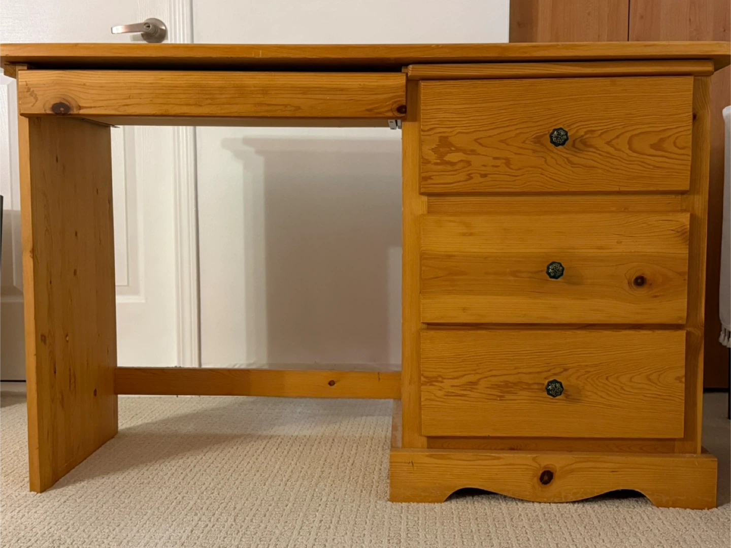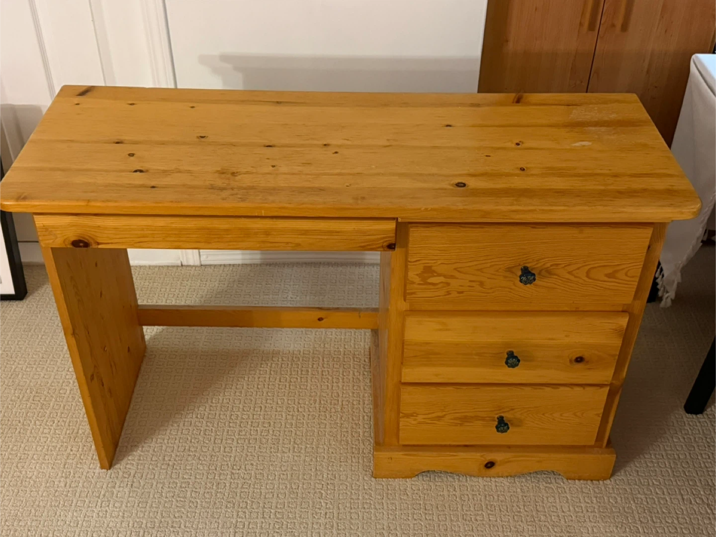 A sturdy wooden writing desk featuring three drawers for storage. It's made from light-coloured wood with a natural finish. This desk is perfect for a home office or student's room.