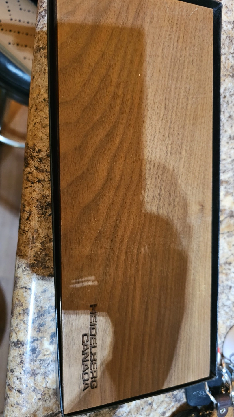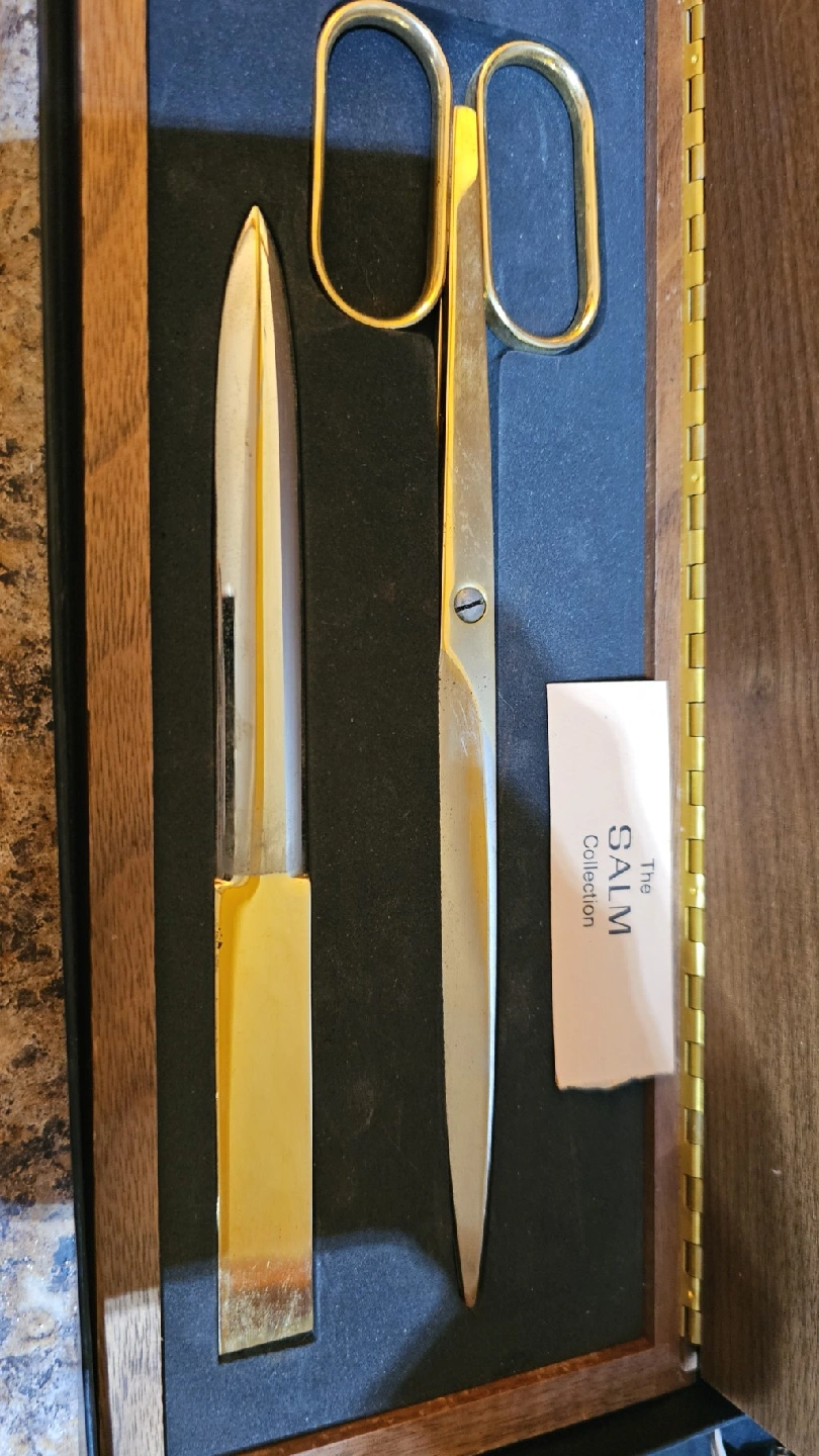 This is a beautiful Heidelberg Canada letter opener and scissors set. The set includes a letter opener and a pair of scissors, both with gold-tone finish. The set comes in a wooden box. 60$ OBO