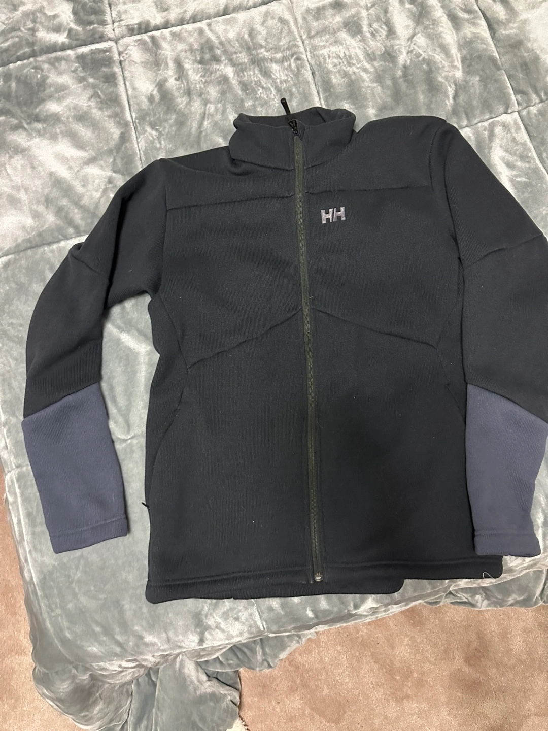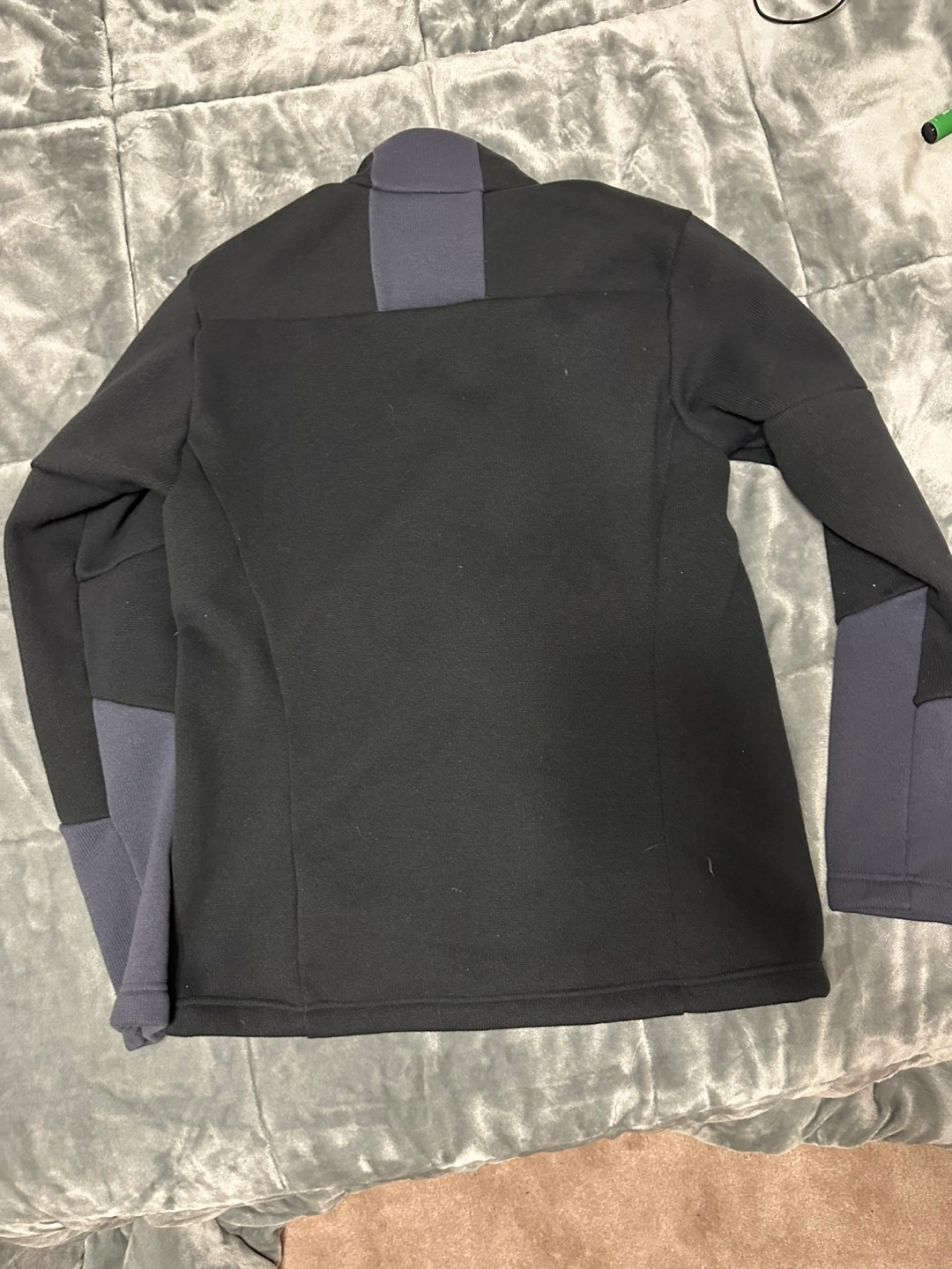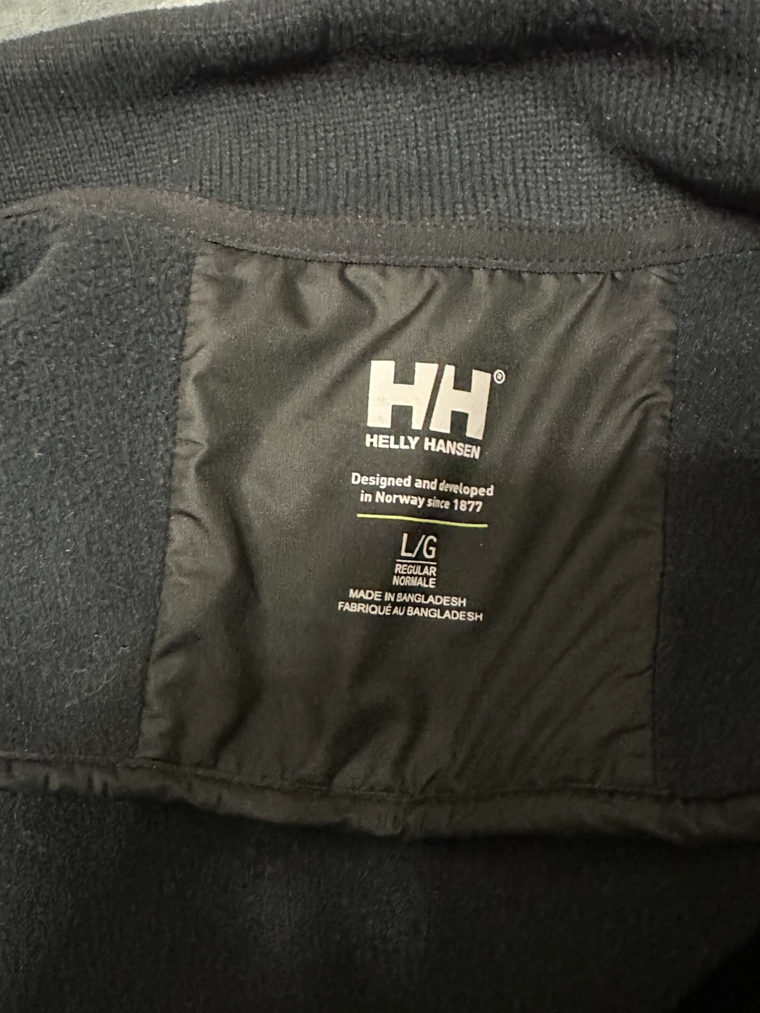 131Men's black fleece jacket. Size large. Features a zipper closure and colour block design. Made in Bangladesh.
