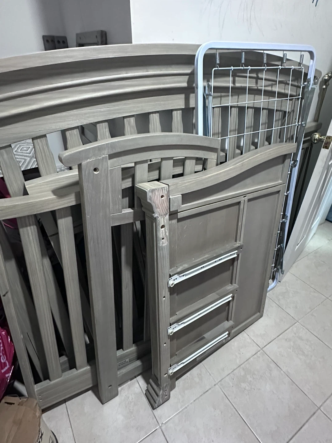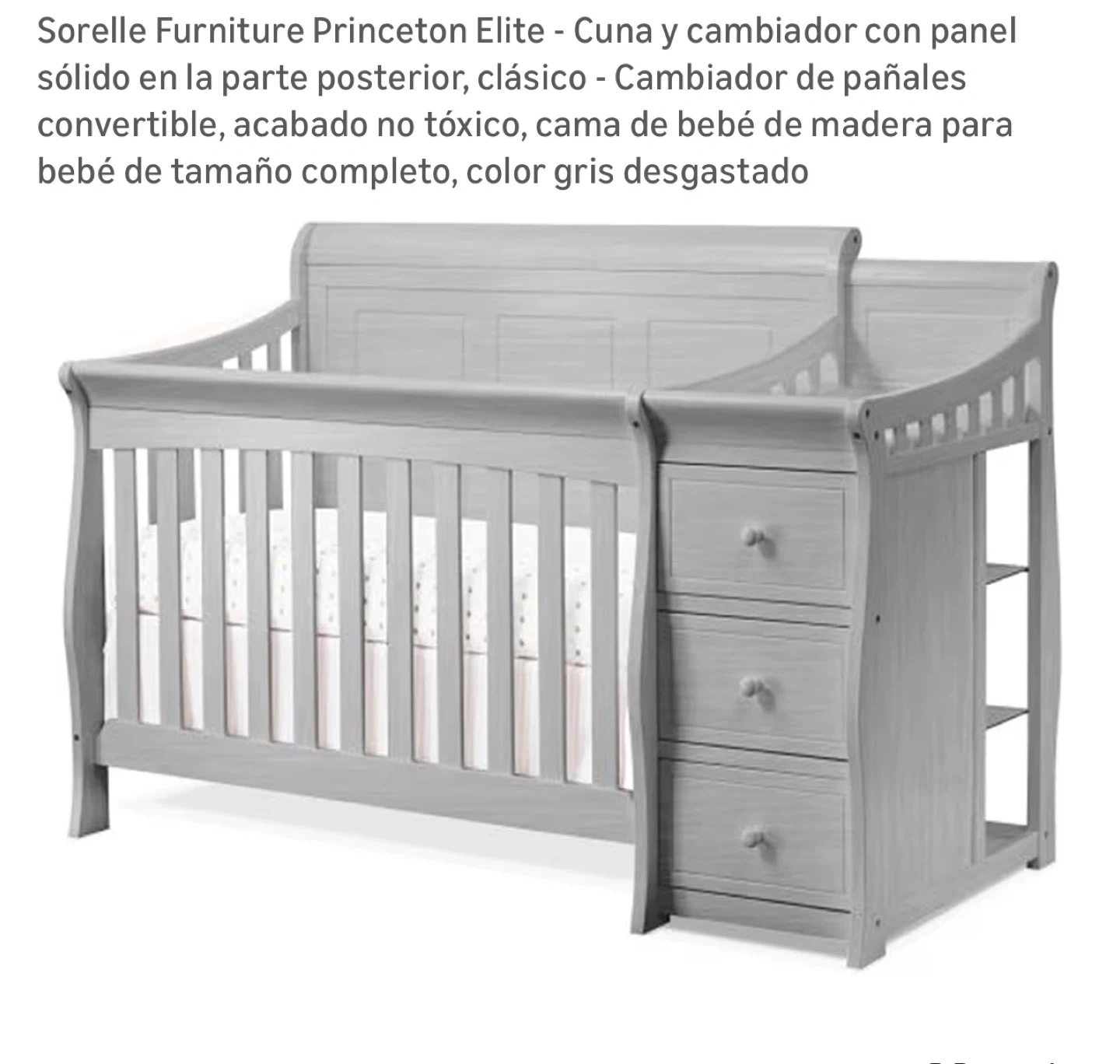 This Sorelle Furniture Princeton Elite convertible crib and changer is a versatile nursery solution. It features a solid back panel and a non-toxic, distressed gray wood finish. The crib converts to a toddler bed and daybed, offering long-term use.
