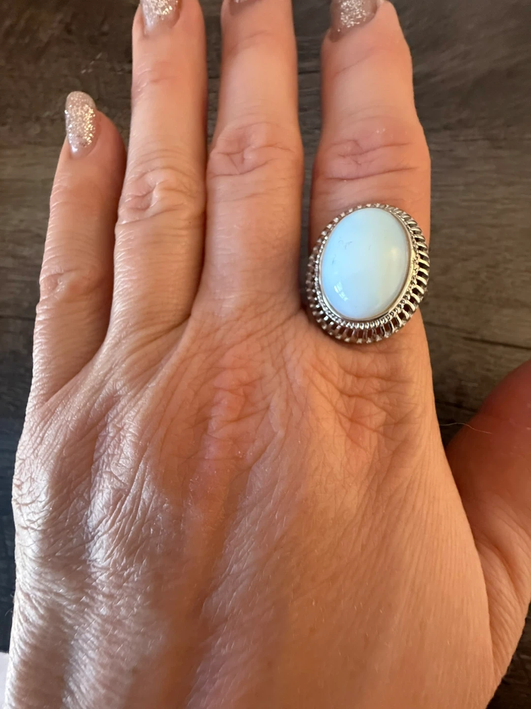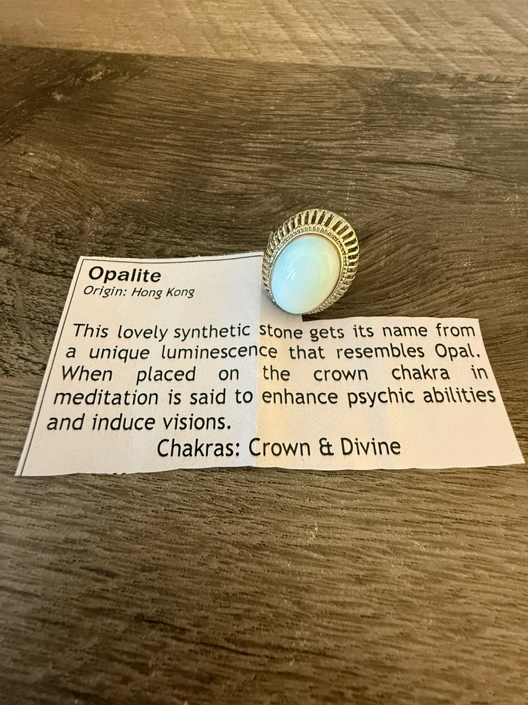 This ring features a lovely opalite stone. It's set in a silver-toned metal band with a decorative edge. This piece is perfect for adding a touch of unique style to any outfit!