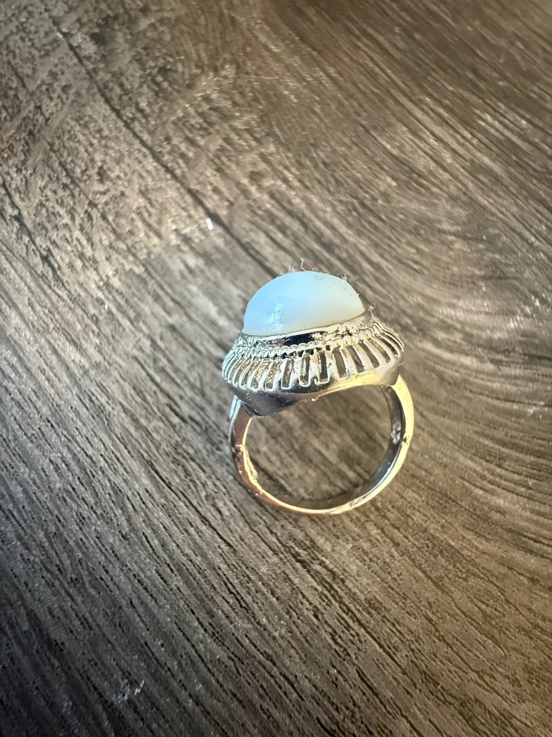 This ring features a lovely opalite stone. It's set in a silver-toned metal band with a decorative edge. This piece is perfect for adding a touch of unique style to any outfit!