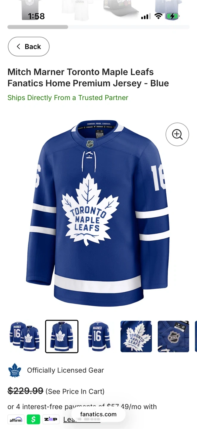 This is a blue Fanatics Toronto Maple Leafs home jersey for Mitch Marner. It's officially licensed gear. It has player name and number on the back. SIzE 4XL.