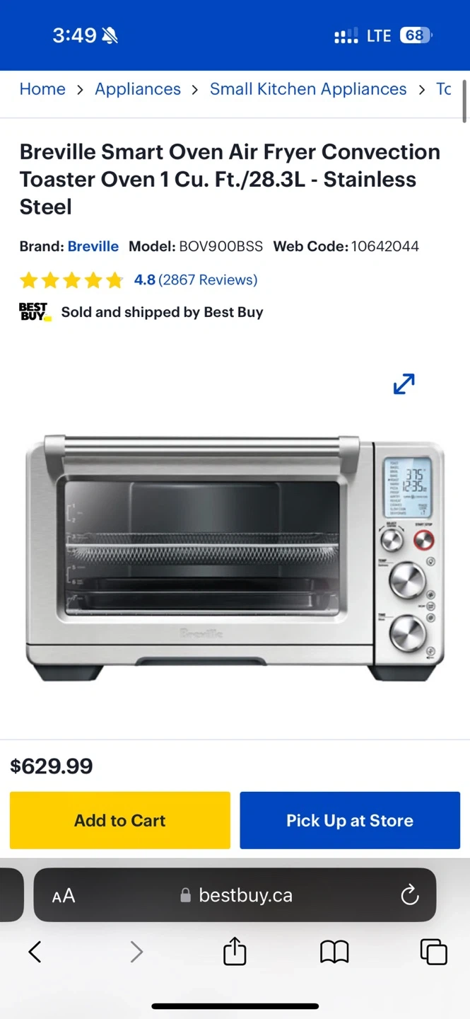 Breville Smart Oven Air Fryer Convection Toaster Oven. Model BOV900BSS. Stainless steel finish. It's a 1-cu. ft. convection toaster oven with air fry functionality.