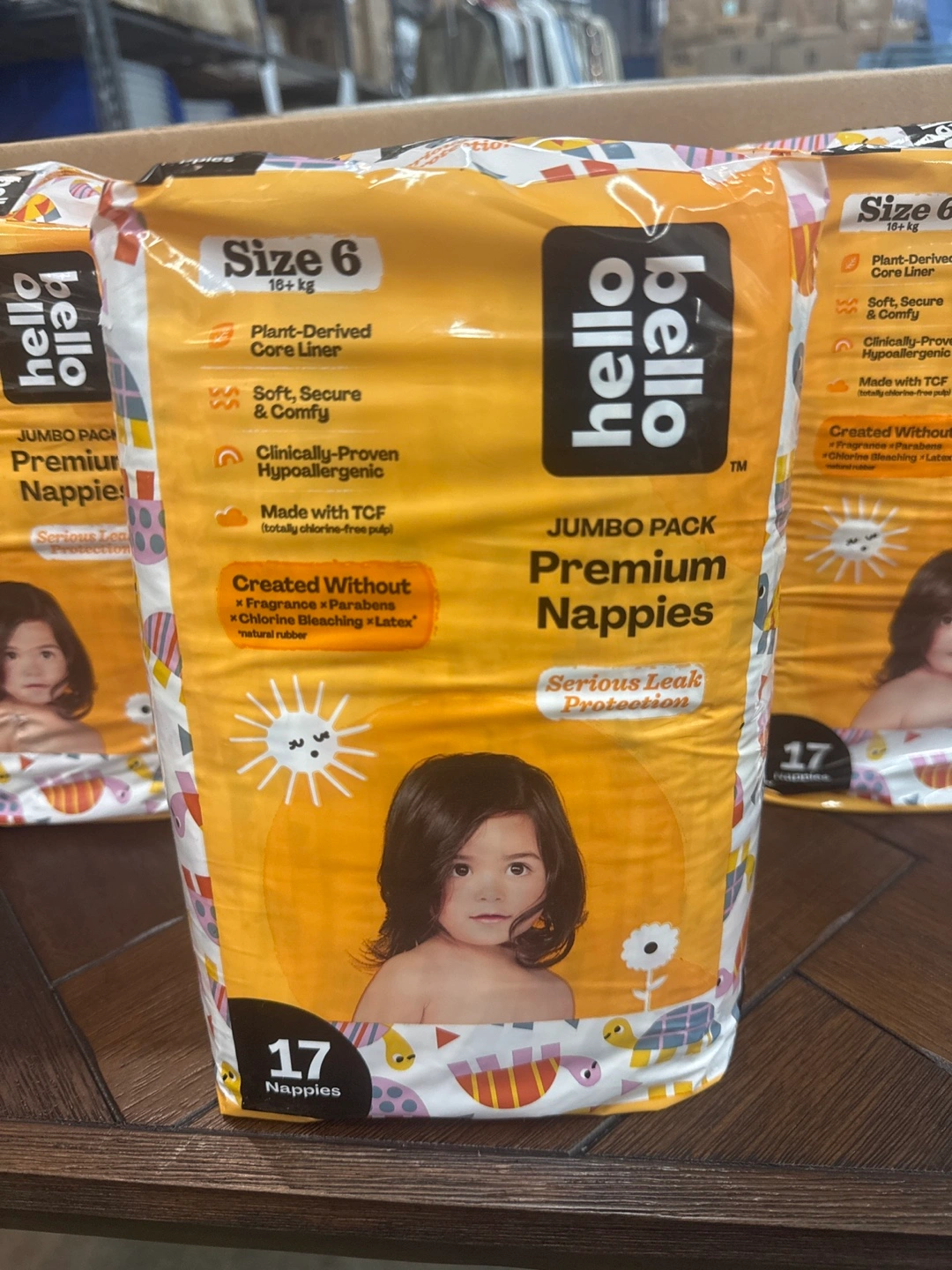Selling Hello Bello Premium Nappies in Size 6 (16+ kg). These nappies are plant-derived, soft, secure, and comfy. They are clinically-proven hypoallergenic and made with TCF (totally chlorine-free pulp). Each jumbo pack contains 17 nappies. Great for your little one! We are selling diapers in bulk 15$ each box 4 packs per box Call me if you have any questions my name is Mathew 647 803-0111