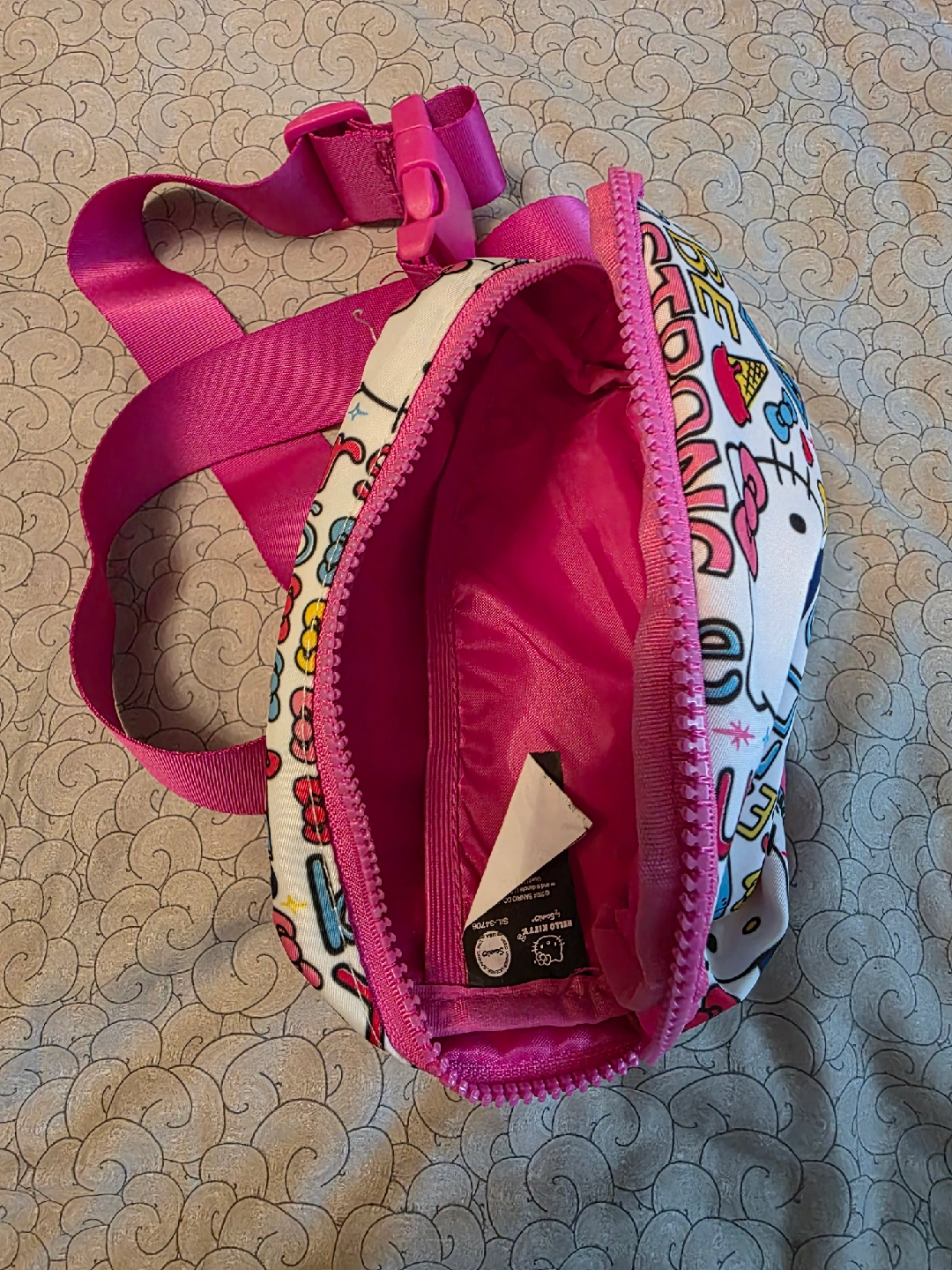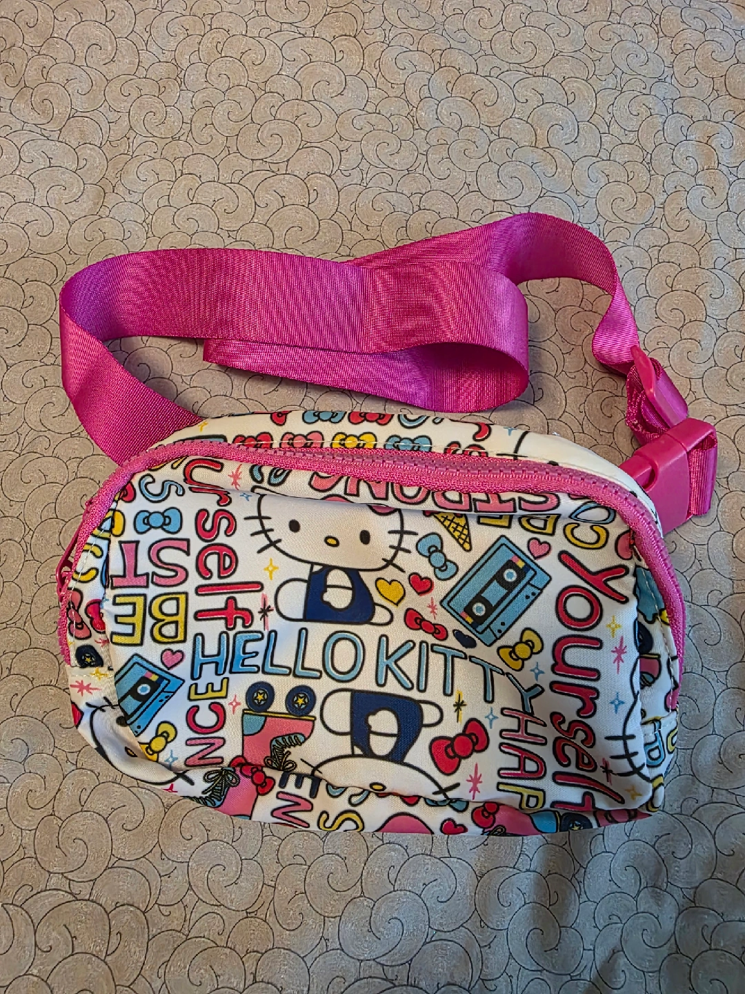 This Hello Kitty belt bag is perfect for carrying your essentials while showing off your love for the iconic character! The bag features a vibrant design with Hello Kitty and various cute icons. It has a pink zipper and adjustable pink strap. Great for kids and adults alike!