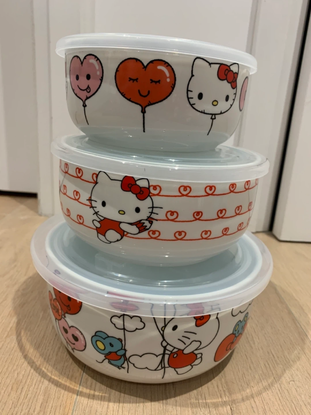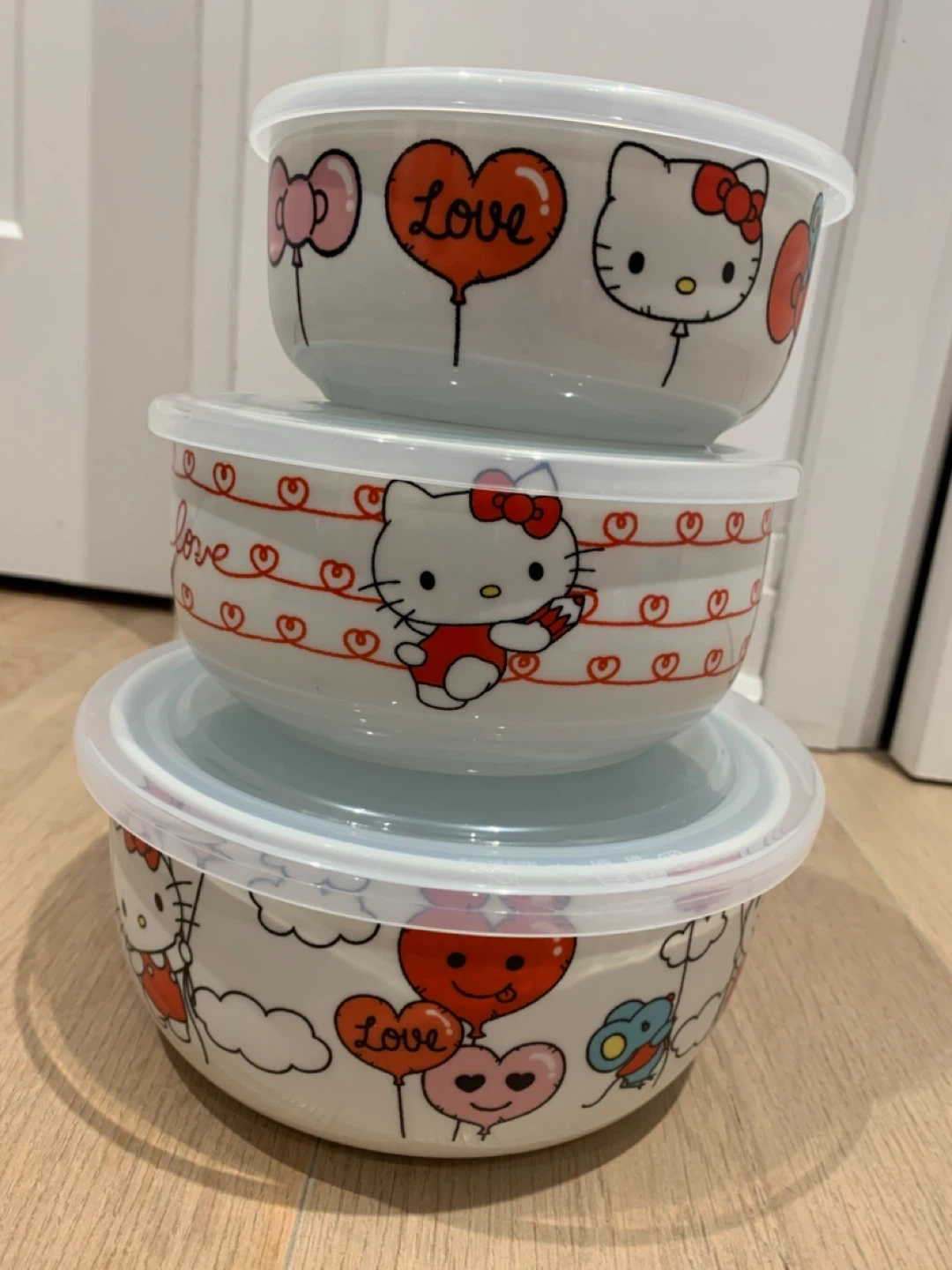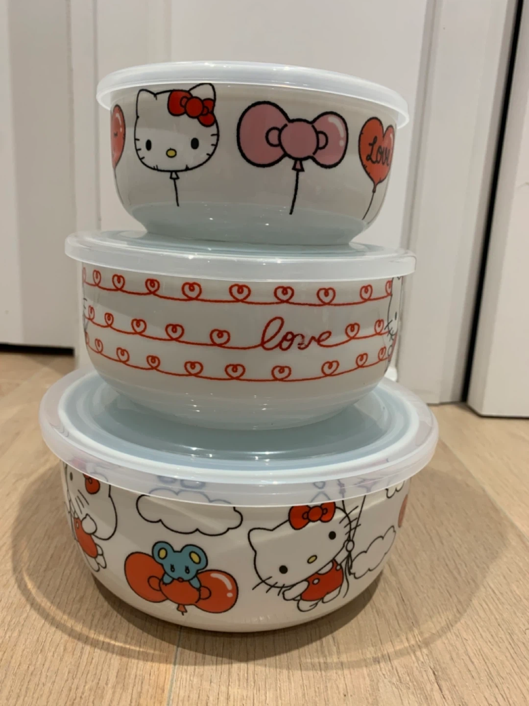 445Brand new set of 3 Hello Kitty Ceramic bowls with lids! These are super cute and perfect for storing leftovers or packing lunches. They feature adorable Hello Kitty designs. Originally priced at $35 plus taxes.