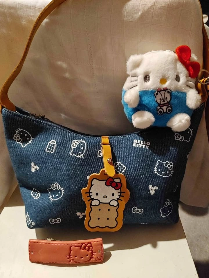 33Denim Shoulder Bag - can fit a cell phone and small purse - zippered closure Fuzzy Coin purse - to put coins, keys, or lip gloss Free hair clip :) Brand new Thanks!