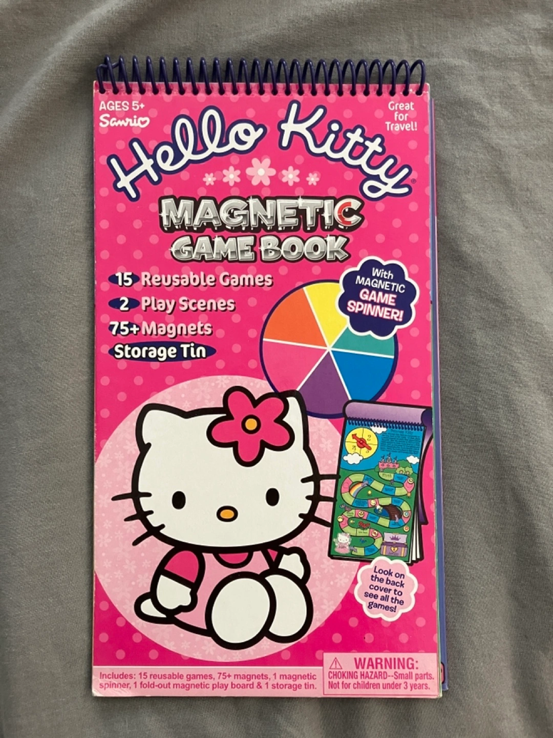 87I'm selling a used Hello Kitty Magnetic Game Book in good condition. This book includes 15 reusable games, 2 play scenes, and 75+ magnets, all stored in a collectible storage tin. It's a fun and engaging activity for kids aged 5 and up. The magnets are bright, colourful, and the book is in great shape for hours of entertainment. Specifications: * Includes: 15 Reusable Games * Play Scenes: 2 * Magnets: 75+ * Storage: Collectible Tin