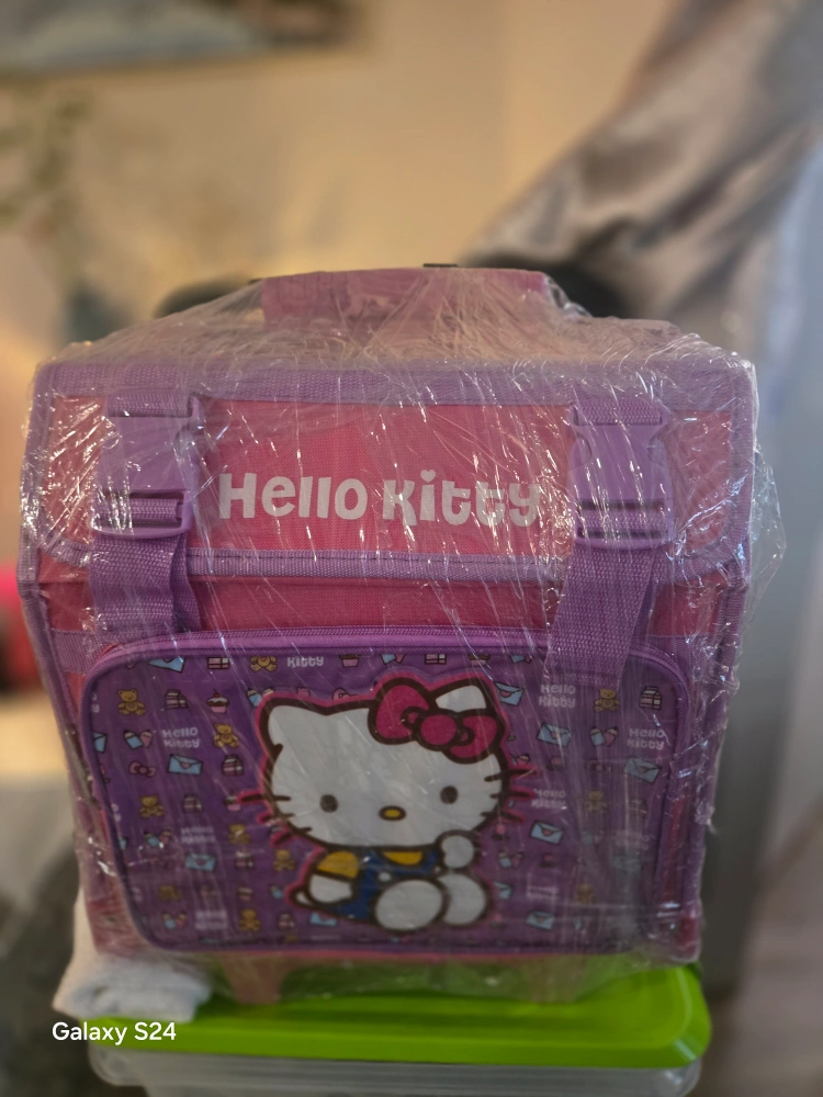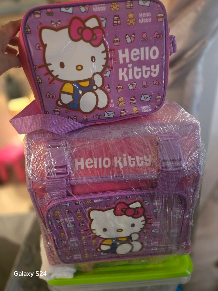Selling a cute Hello Kitty bag with wheela and lunch bag set! The lunch bag is purple and pink, and the small bag is purple. Perfect for any Hello Kitty fan! Used for 3-5 times only..