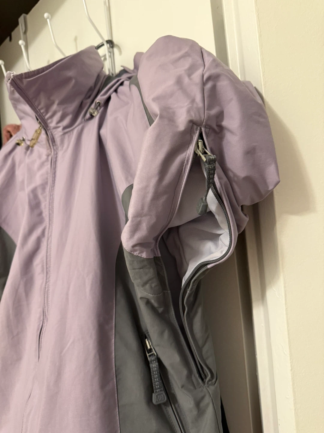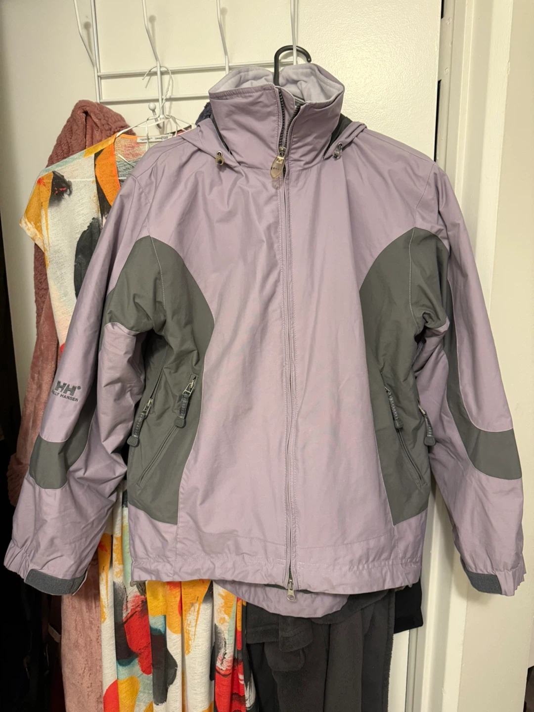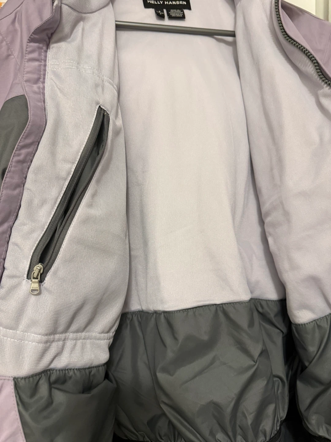 339Selling a Helly Hansen jacket in a lovely lilac and gray color combination! It's a size small. Perfect for outdoor activities or just staying warm on chilly days. It features a hood and several zippered pockets. Armpit area can also be zipped open.