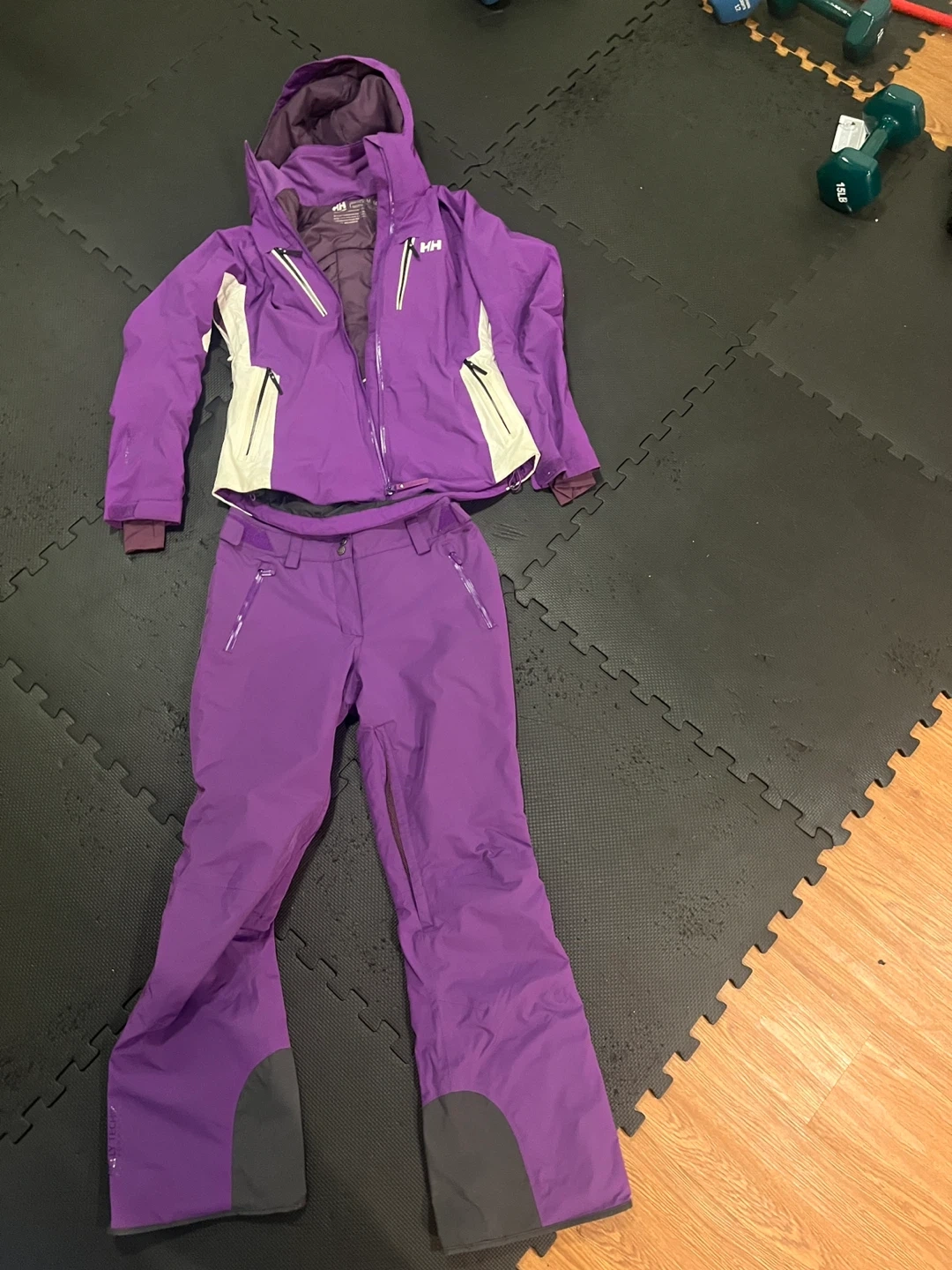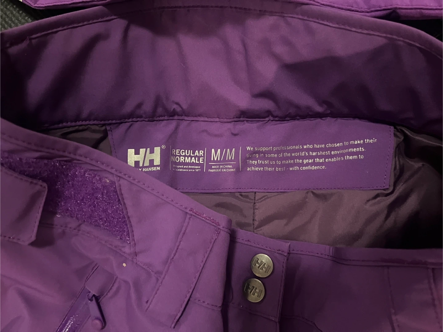 Selling a womens Helly Hansen snowsuit in purple. The size is M/M. It's waterproof and has H-Flow technology to keep you warm and dry on the slopes! It also has a RECCO rescue system for added safety