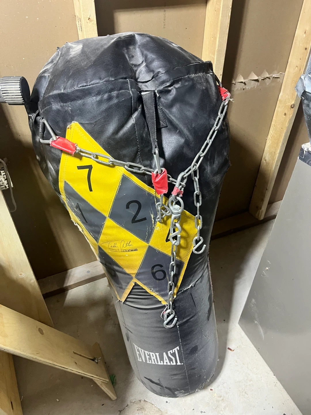 This is an Everlast punching bag. It's made of durable black material and comes with heavy-duty chains for hanging. Perfect for your home gym setup!