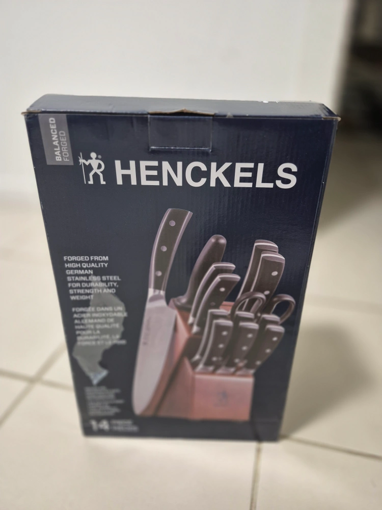 12Selling a Henckels 14-piece knife block set! The knives are forged from high-quality German stainless steel for durability, strength, and weight. The box is included
