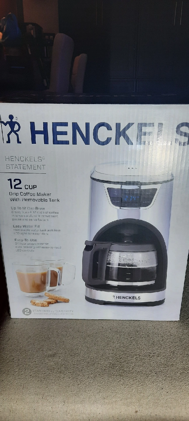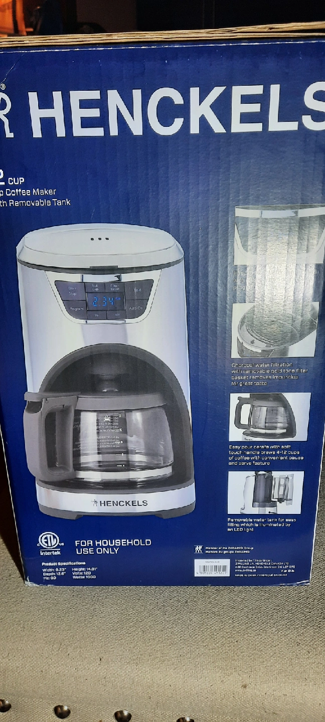Selling a brand new HENCKELS 2.2-L drip coffee maker! It's still in its original box and has never been used. It makes up to 12 cups of coffee and has a removable tank for easy filling. The original price was $169.99. Ended up buying a machine with an espresso option as well. My loss your gain!