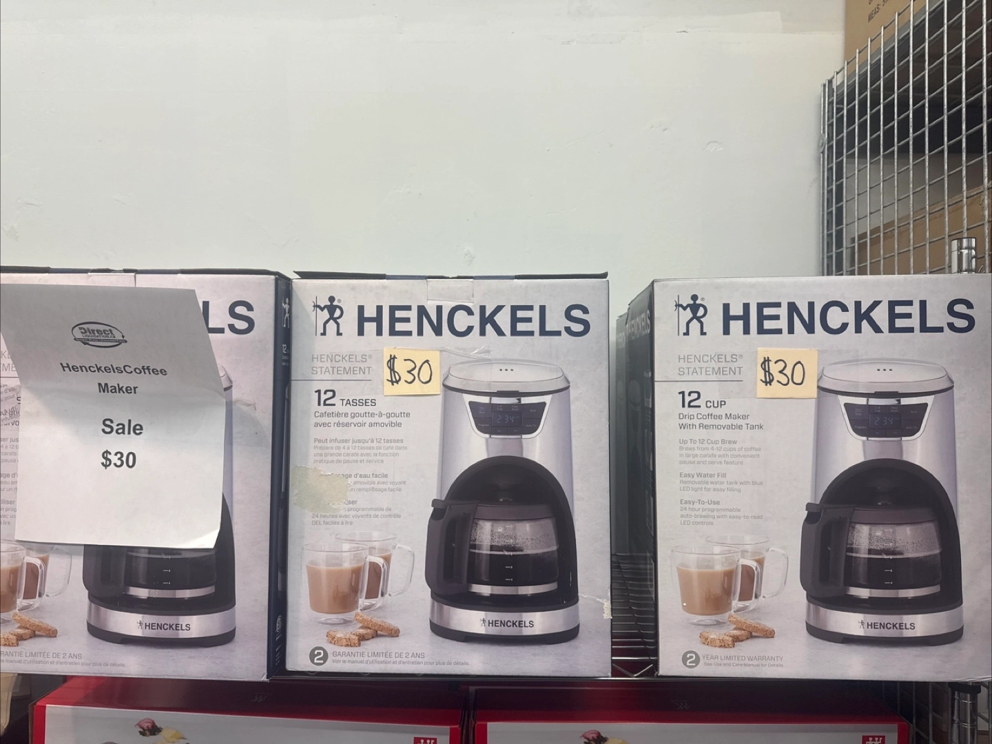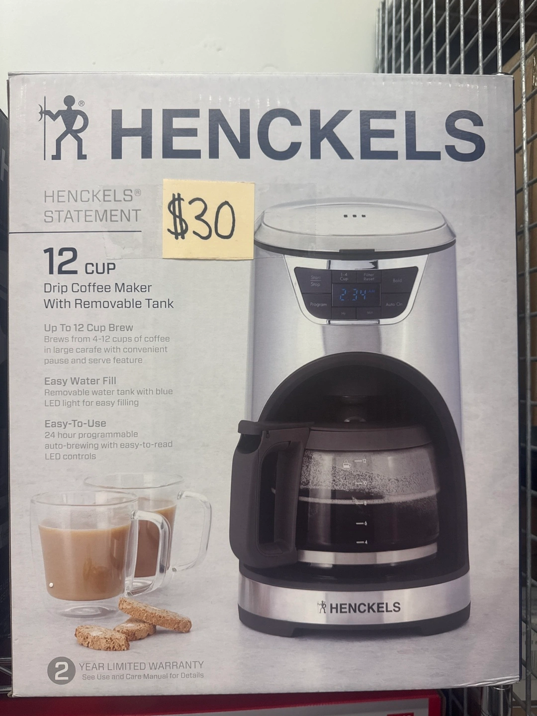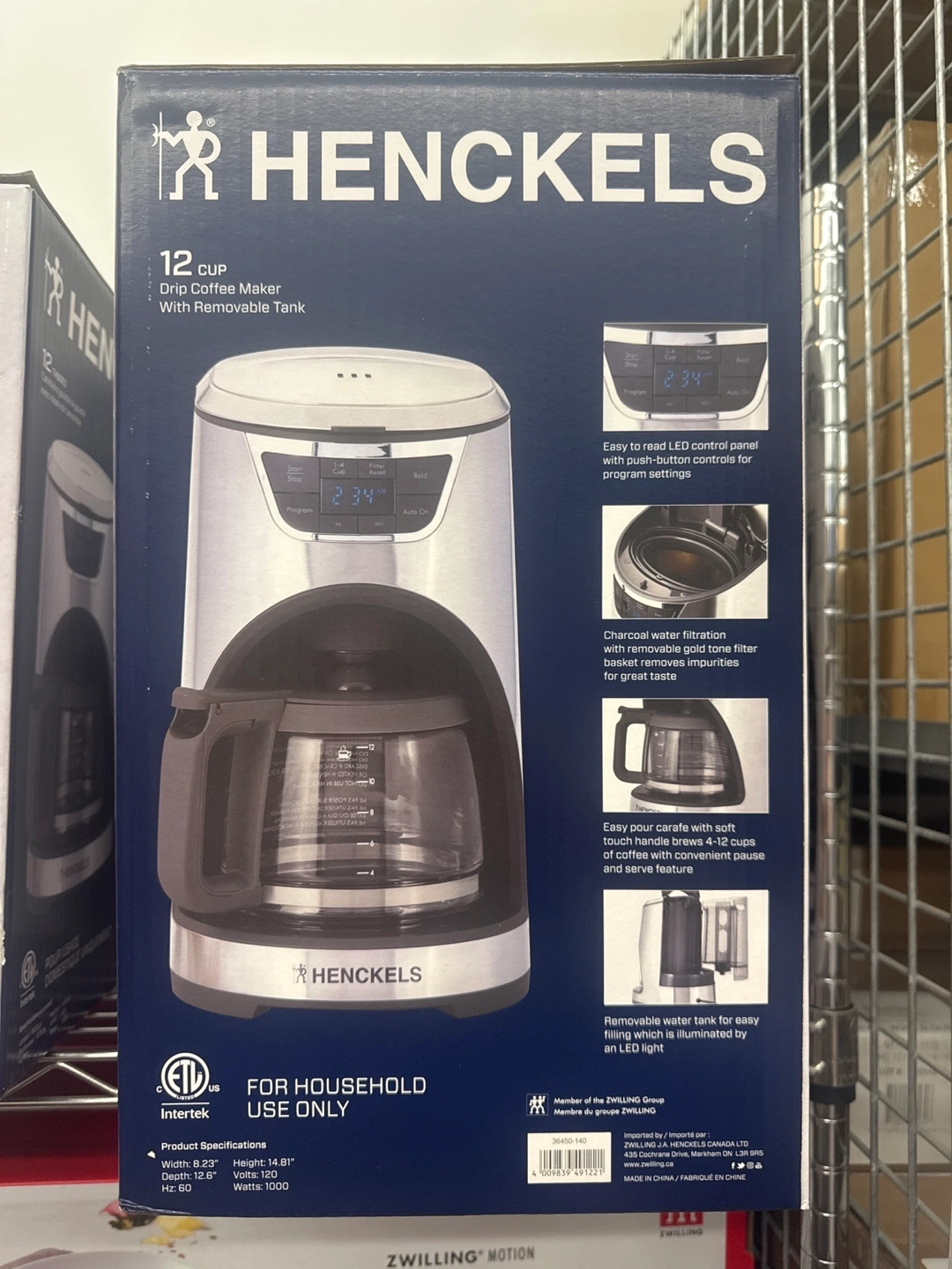 Selling a brand new Henckels Statement 12-cup drip coffee maker with a removable tank! It brews from 4-12 cups of coffee in a large carafe and has a convenient pause and serve feature. - Easy water fill with a removable water tank with blue LED light - Easy to use with 24-hour programmability and auto-shutoff with easy-to-read LED controls Charcoal water filtration helps remove chlorine and impurities for great taste! Any questions call Mathew 647 803 0111 We are located at 2480 cawthra rd unit 15 open 10-5 everyday closed on Mondays
