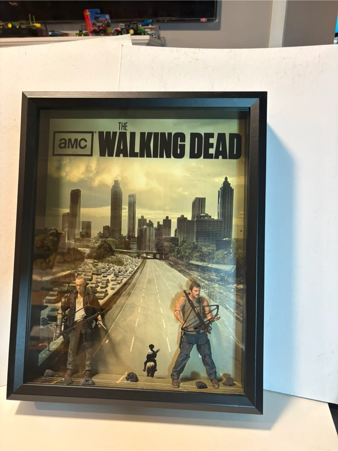 This shadow box features artwork and figures from The Walking Dead. It depicts the iconic Atlanta highway scene. The display includes figures of Daryl Dixon and Rick Grimes.