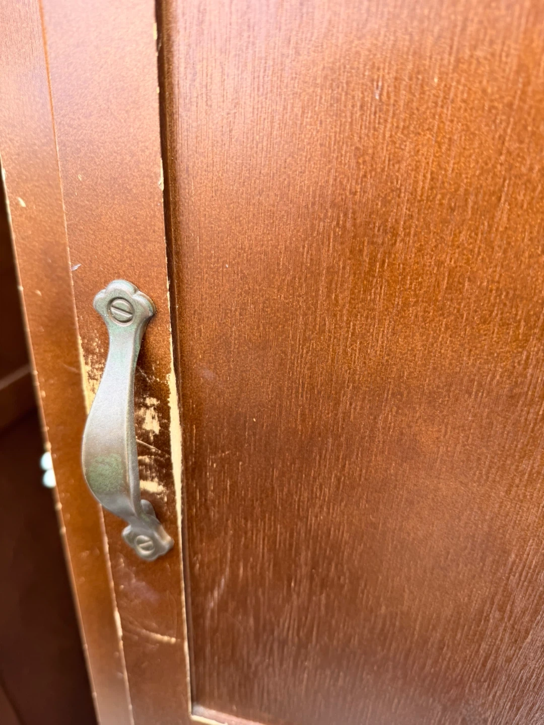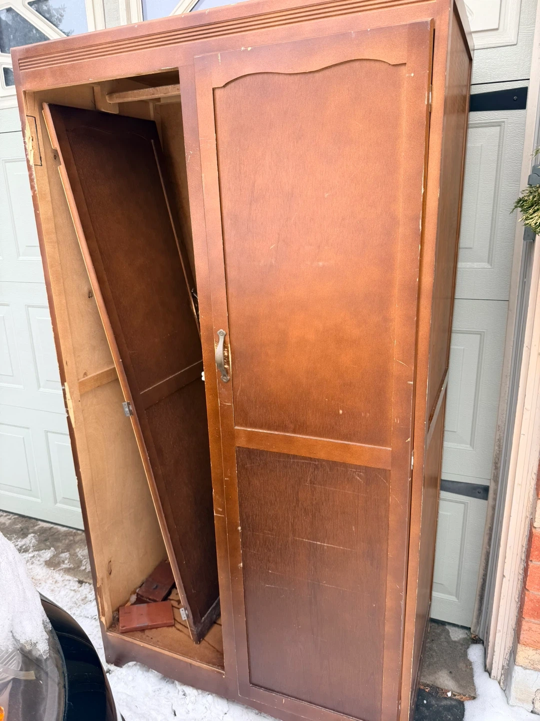 It's a classic wooden wardrobe armoire with double doors and a hanging rail inside. The wood finish is a warm brown. It's a great storage solution for a bedroom or entryway. Minor wear visible on the exterior.