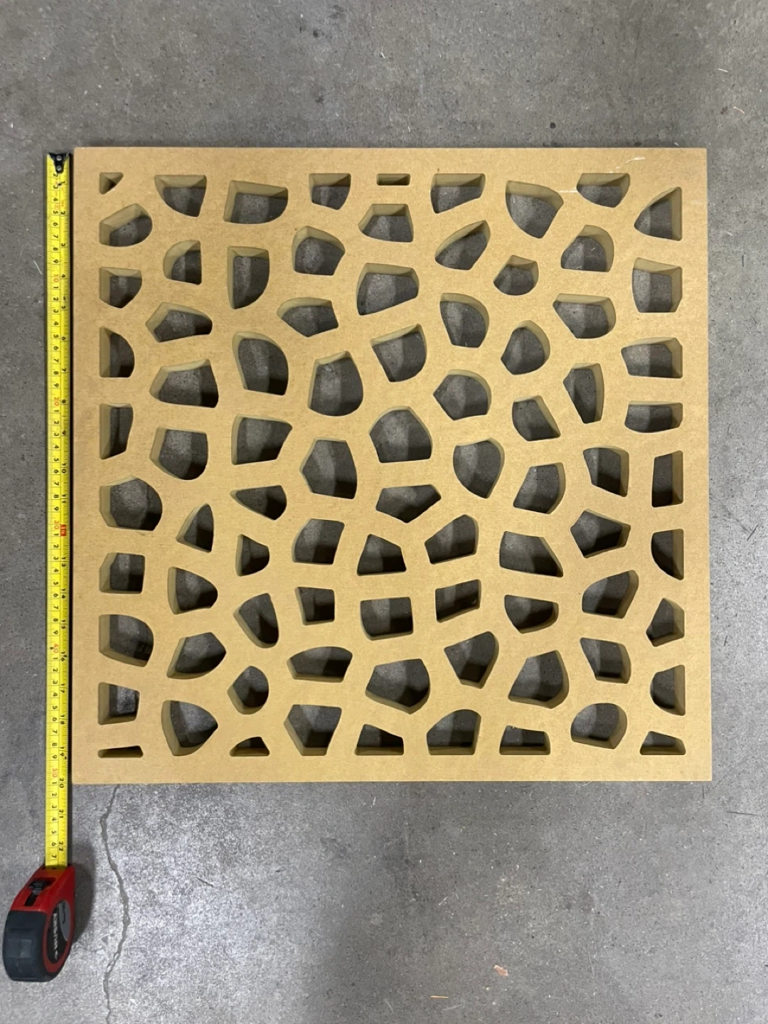 Set of seven decorative lattice panels. Each panel measures approximately 24 inches by 24 inches. Made from MDF material with a Moroccan-inspired geometric cut-out design. These panels can be used for various DIY and home decor projects, such as room dividers or wall accents.