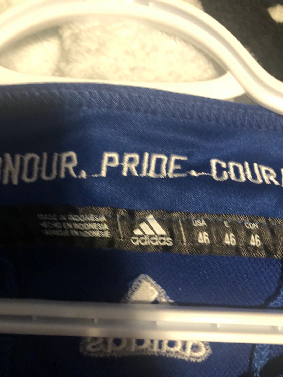 This is an Adidas Toronto Maple Leafs hockey jersey. It features Auston Matthews' name and number 34. The jersey is blue with white accents and the Maple Leafs logo. It's size 46.
