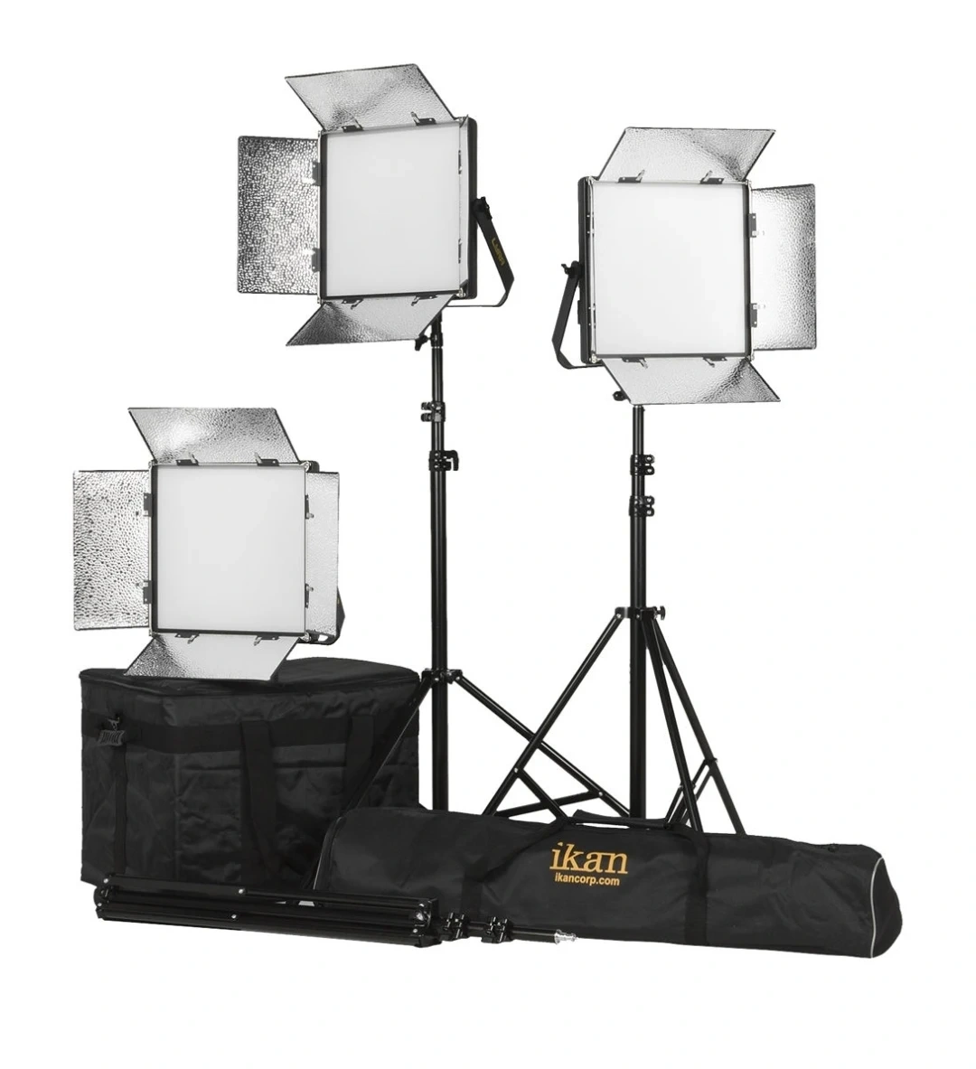 This Ikan lighting kit includes three LED panels with barn doors and diffusion covers. It comes with two stands, a large carrying bag, and a smaller accessory bag. Lights offer adjustable brightness and colour temperature.