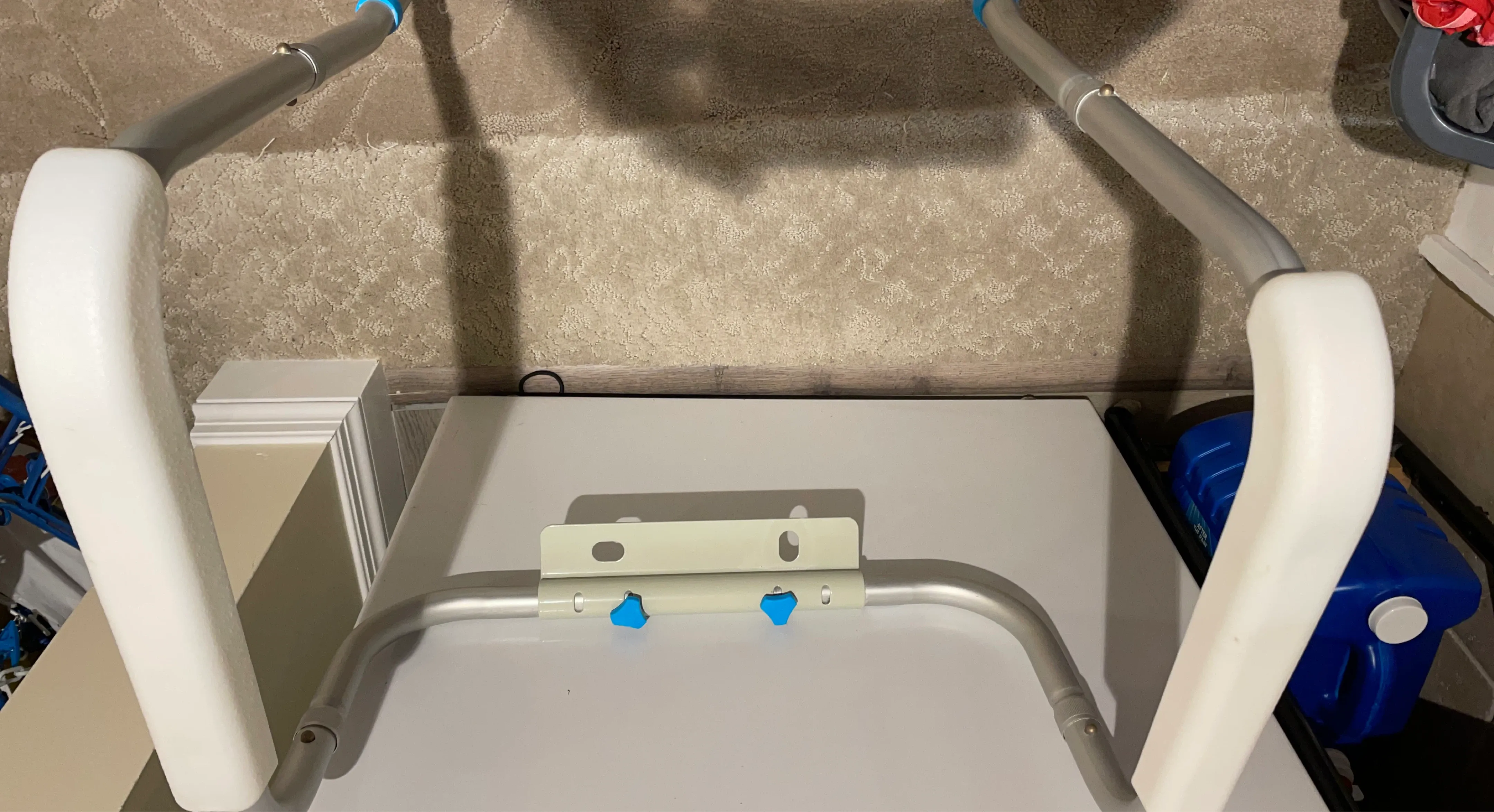 This is an armrest attachment for a shower chair. It's made of metal with white padded grips and blue adjustment knobs. The frame is silver-coloured metal.