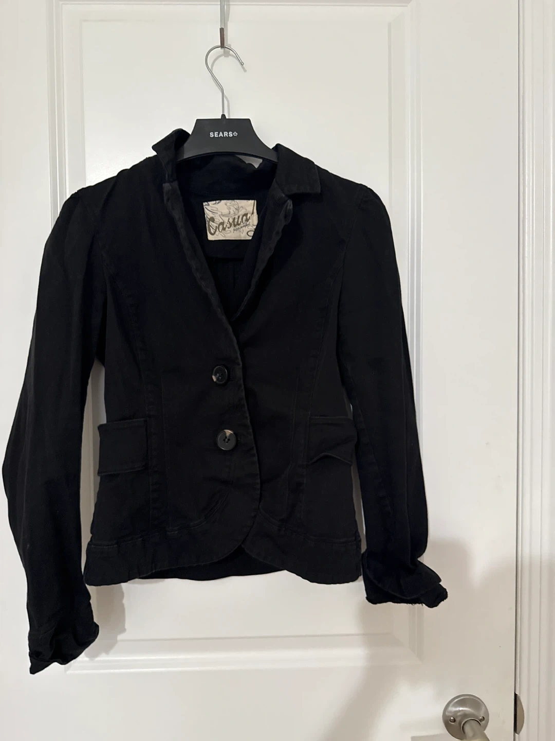 This black jacket is from Casual by pure comfort. It's a size S/P. The jacket has two buttons in the front and two flap pockets.