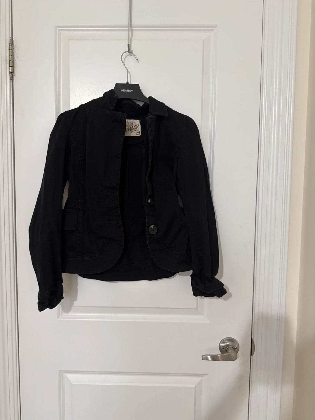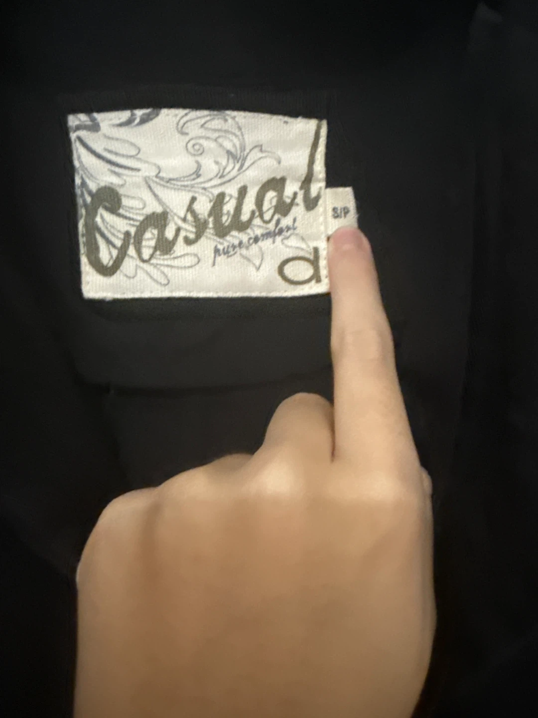 This black jacket is from Casual by pure comfort. It's a size S/P. The jacket has two buttons in the front and two flap pockets.