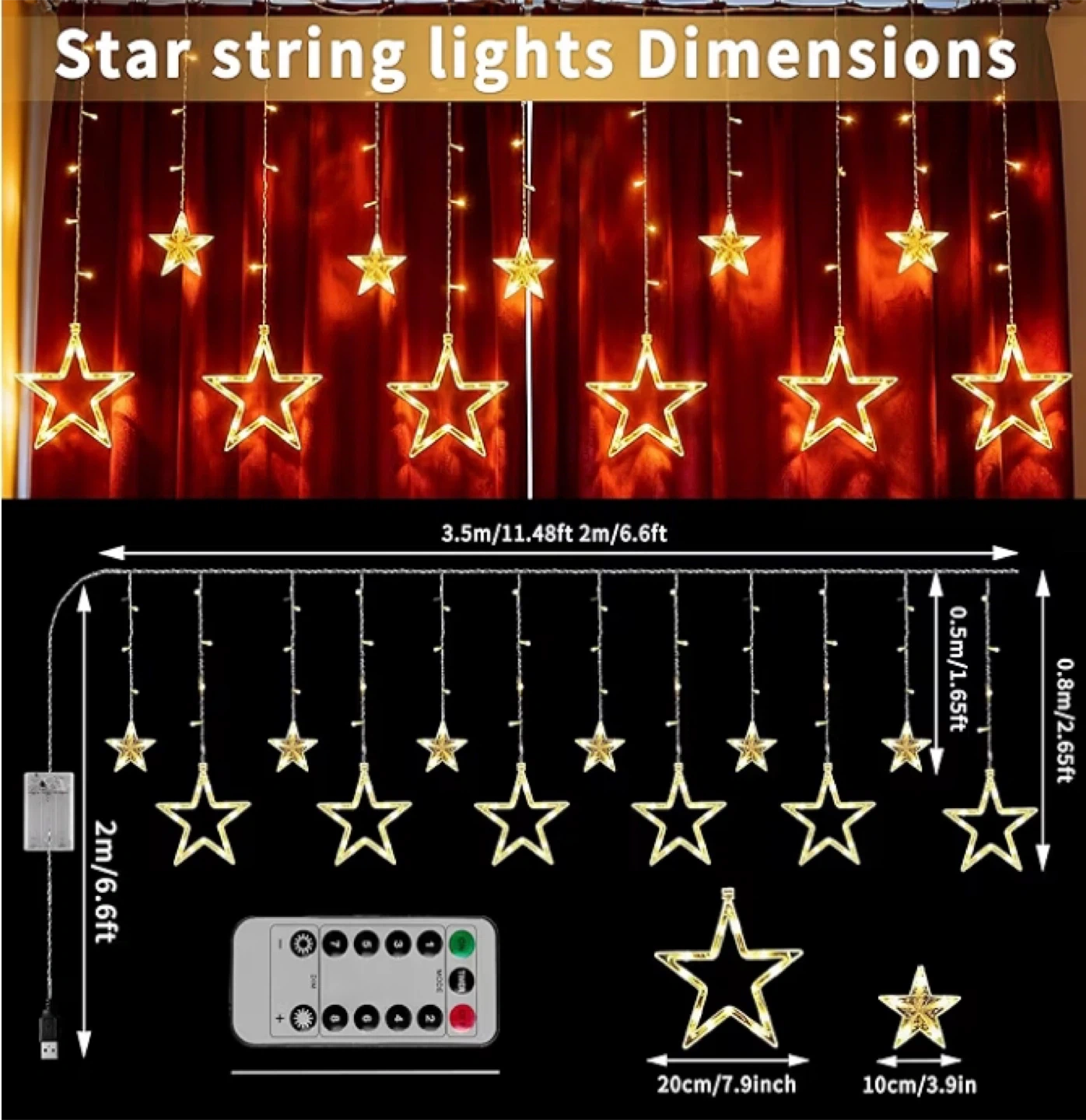 Bright LED star curtain lights. Super cool for decorating any room or window. Has 10 big stars and 10 small stars, total 138 LEDs. Comes with a remote control for 8 different light modes like steady on, flashing, or fade. You can power them up with USB (computer, wall adapter, power bank) or use 3 AA batteries with the included pack. String is about 11.5 feet long, drops are up to 6.6 feet. Big stars are about 7.9 inches, small ones 3.9 inches.