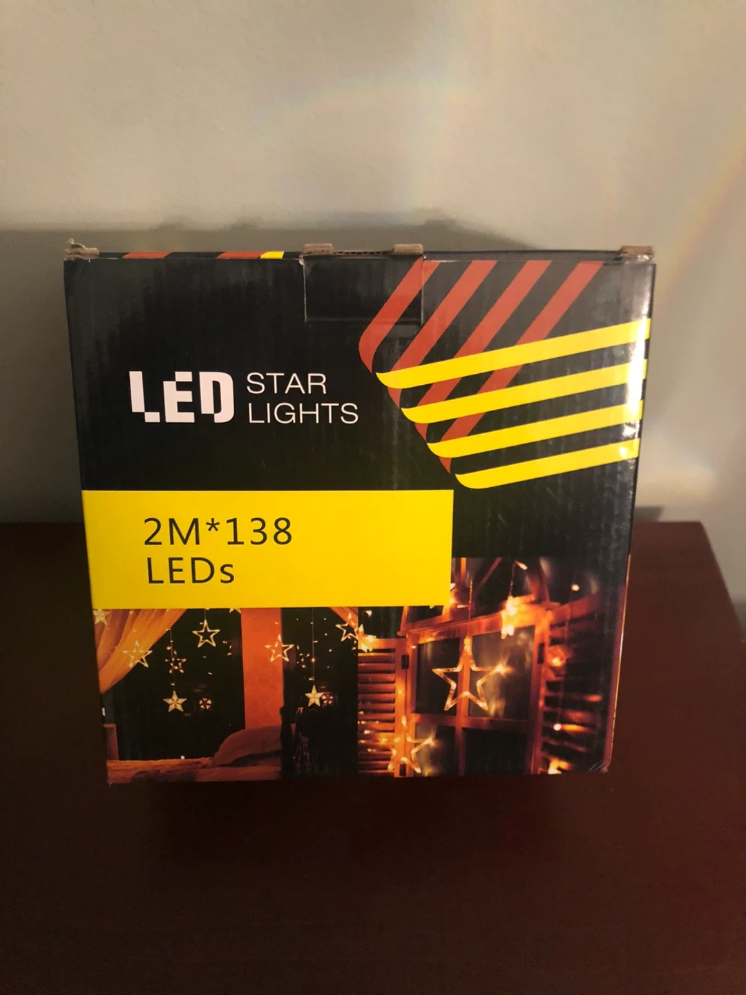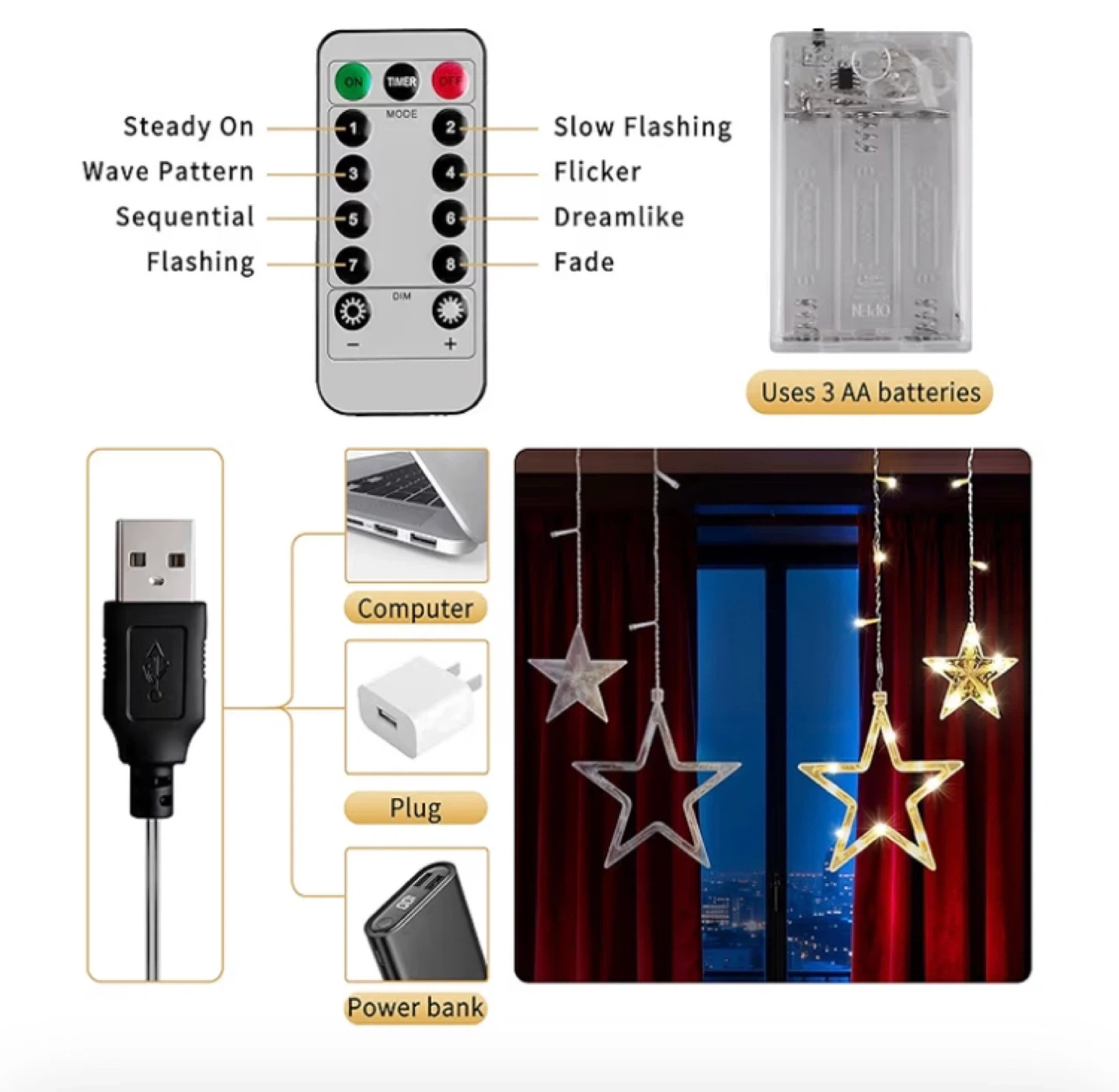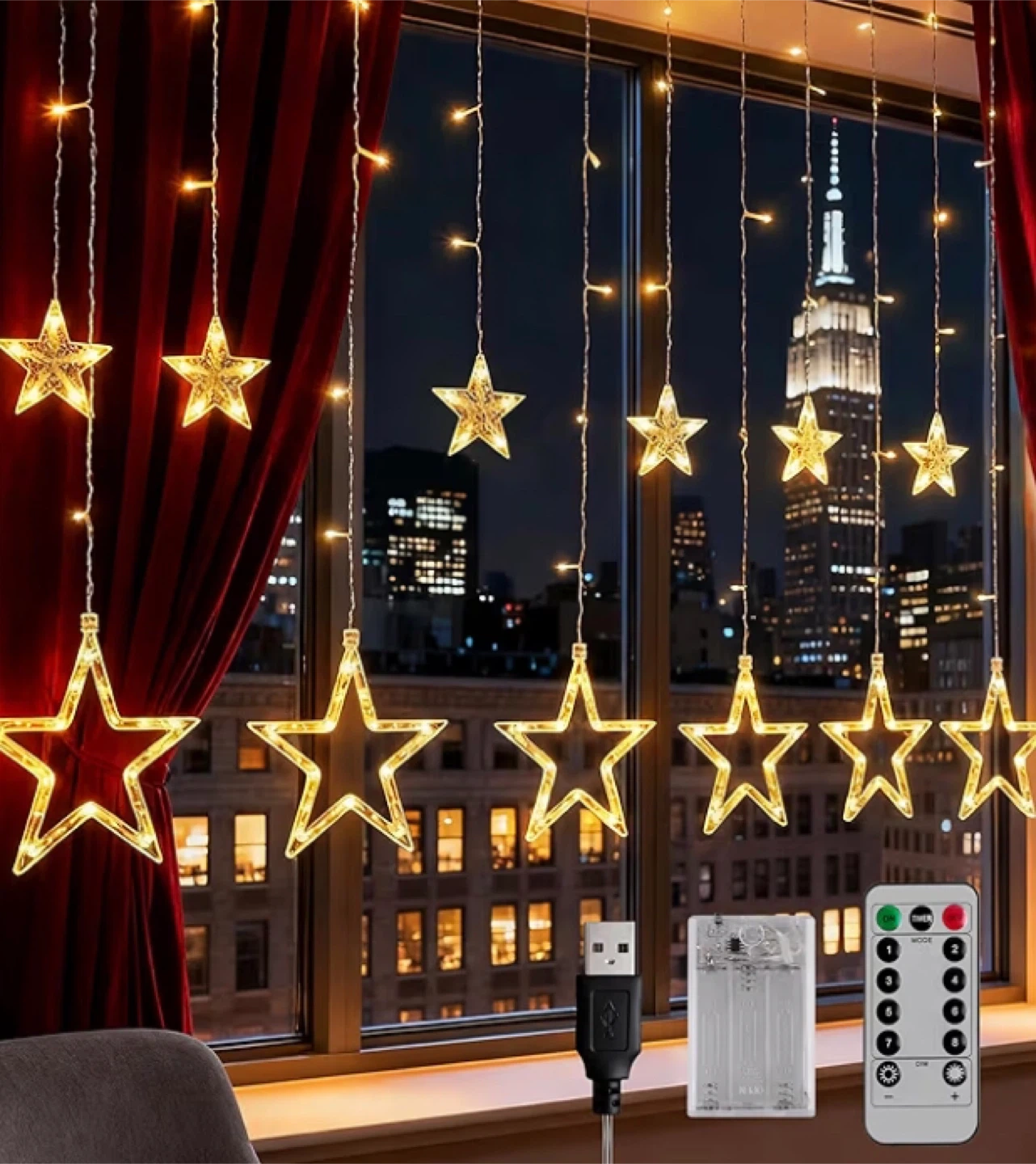 Bright LED star curtain lights. Super cool for decorating any room or window. Has 10 big stars and 10 small stars, total 138 LEDs. Comes with a remote control for 8 different light modes like steady on, flashing, or fade. You can power them up with USB (computer, wall adapter, power bank) or use 3 AA batteries with the included pack. String is about 11.5 feet long, drops are up to 6.6 feet. Big stars are about 7.9 inches, small ones 3.9 inches.