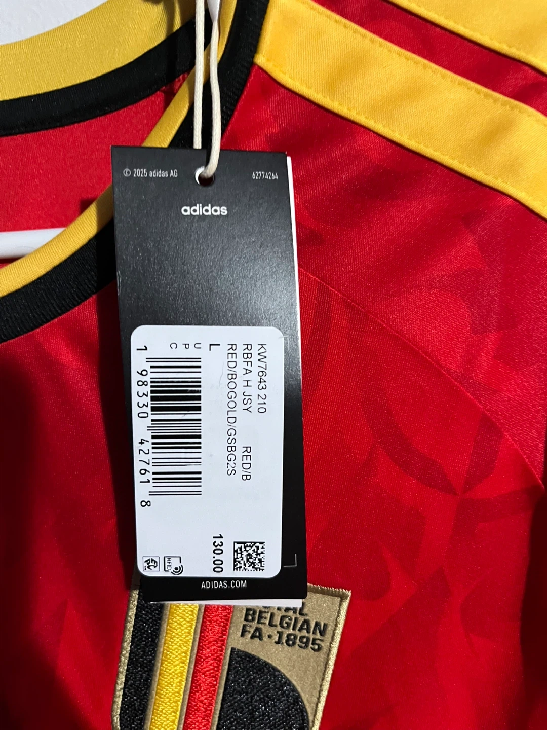 This is an Adidas Belgium national soccer team jersey. It features the name 'De Bruyne' and the number '7' on the back. The jersey is red with yellow and black accents.