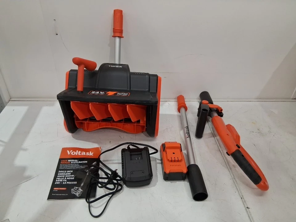 I'm selling a Voltask cordless snow shovel, equipped with a 24V 4.0Ah battery. This snow shovel is in great condition, functional and ready to help you tackle winter snow. It features a 13-inch clearing width and adjustable directional control for efficient snow removal.