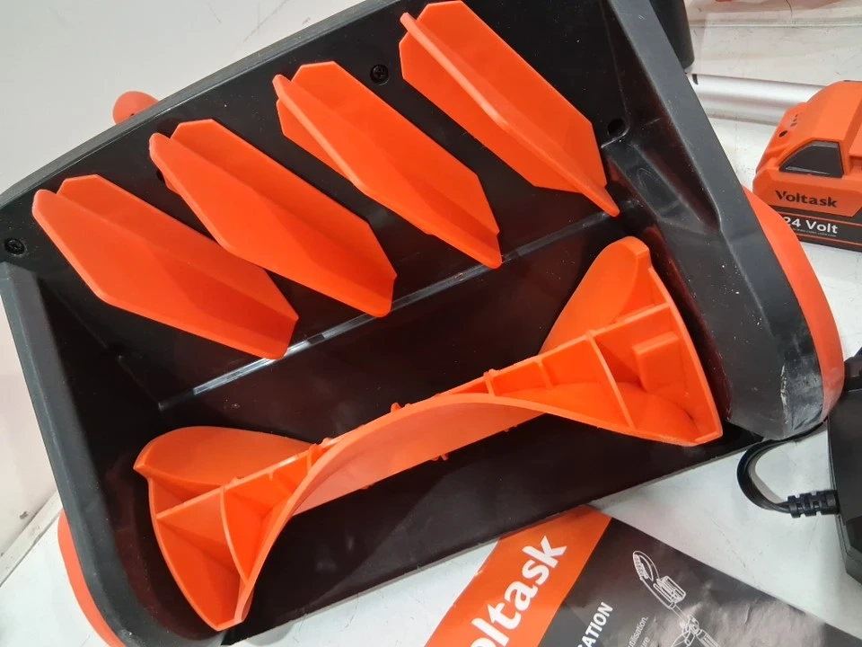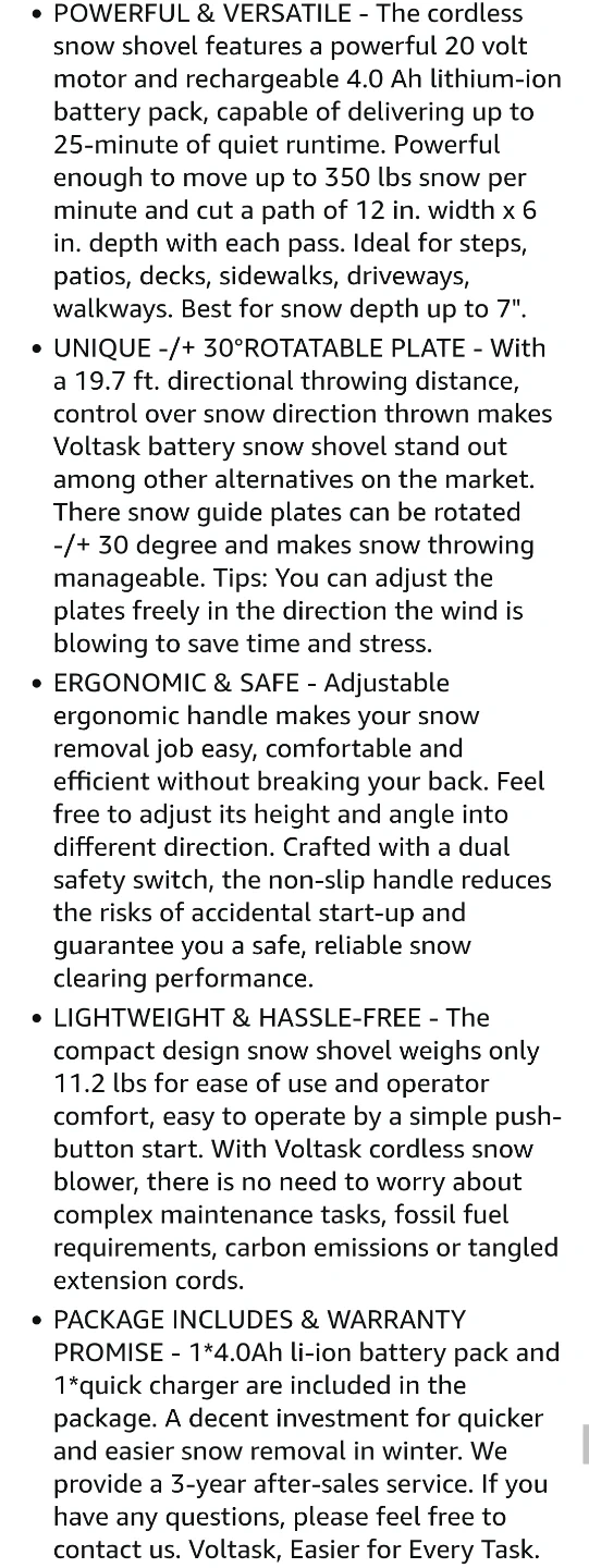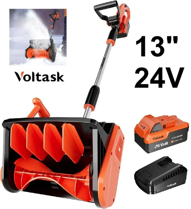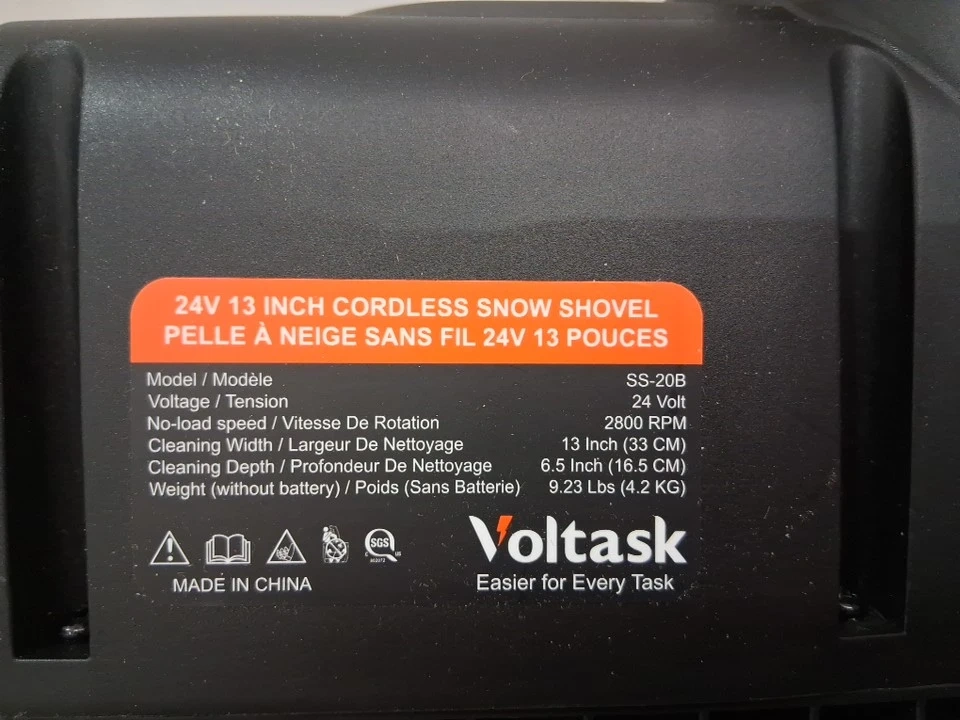 I'm selling a Voltask cordless snow shovel, equipped with a 24V 4.0Ah battery. This snow shovel is in great condition, functional and ready to help you tackle winter snow. It features a 13-inch clearing width and adjustable directional control for efficient snow removal.
