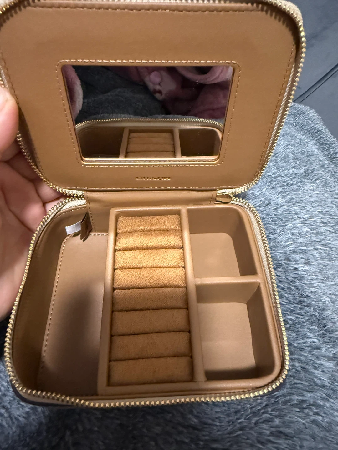 This is a Brand new Coach jewellery box! . It's perfect for storing your precious items at home or while travelling. The interior has compartments for rings, necklaces, and other accessories. It also has a mirror inside