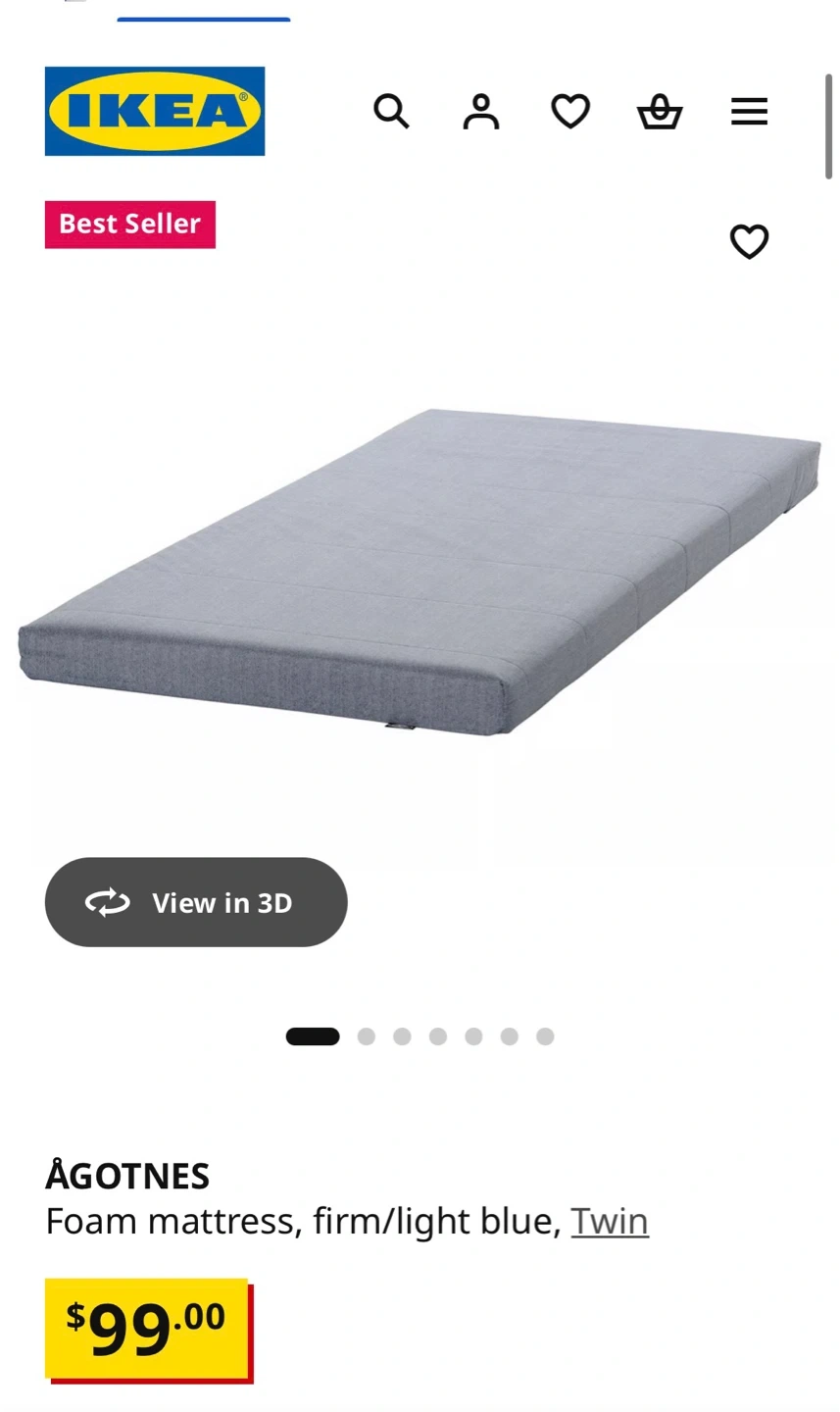 This is an IKEA ÅGOTNES foam mattress in a light blue, twin size. It's a firm mattress with a quilted surface. It's useful for guest rooms or small living spaces.