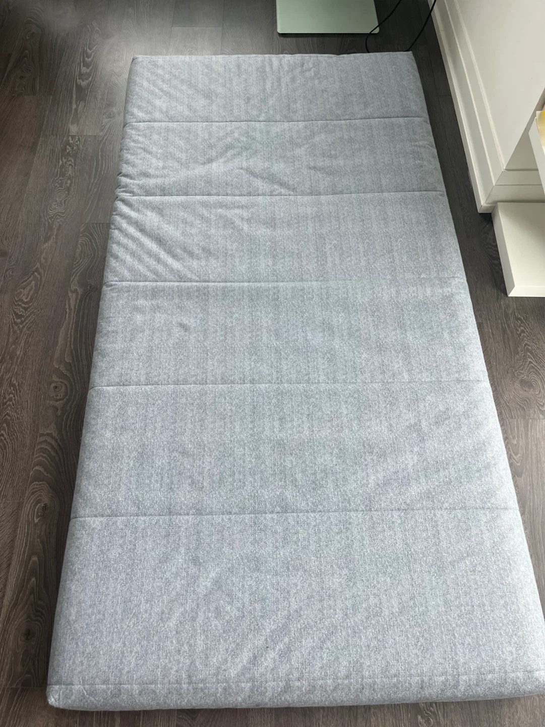 This is an IKEA ÅGOTNES foam mattress in a light blue, twin size. It's a firm mattress with a quilted surface. It's useful for guest rooms or small living spaces.