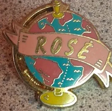 This is a globe-shaped pin from THE ROSE MANSION with 'ROSE' written on a banner. It's made of metal with enamel detailing in pink, teal, and yellow. The pin has a classic gold-tone finish.