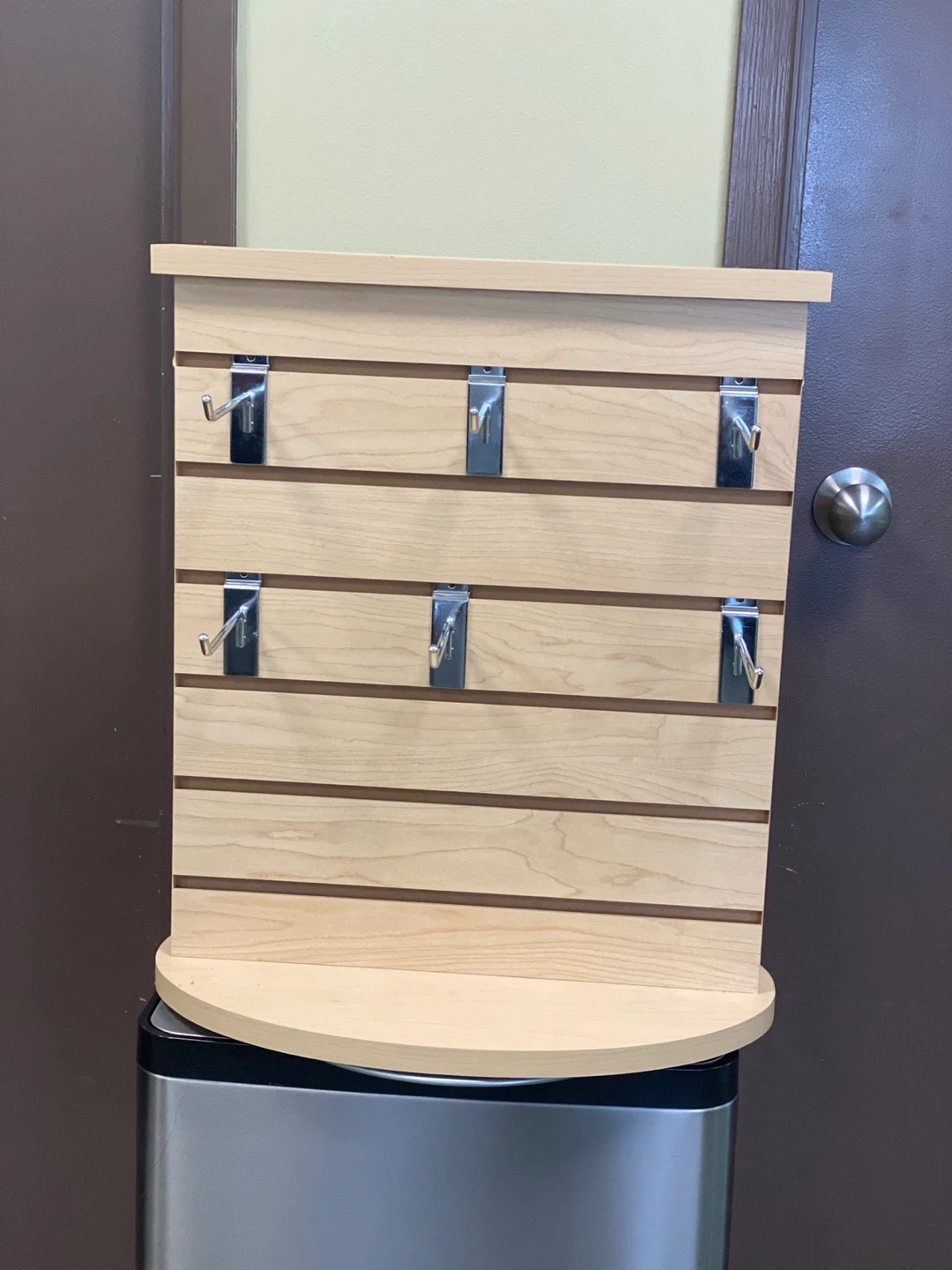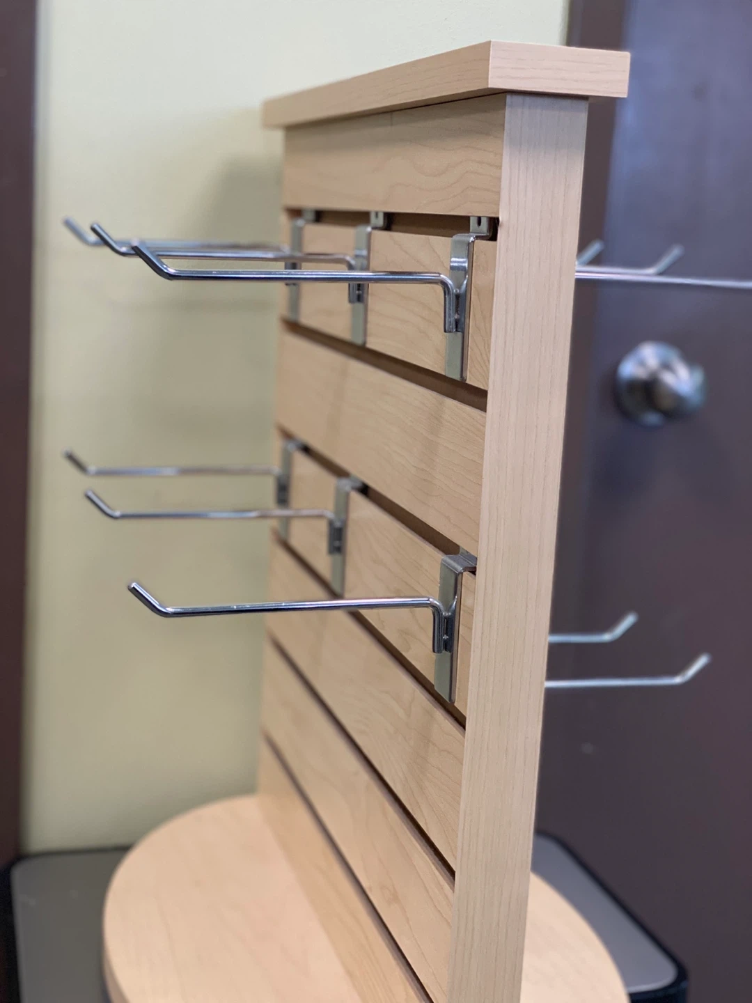 Wooden rotating display stand with multiple metal hooks. Great for small retail items or craft fairs. Stand it on your counter or table!